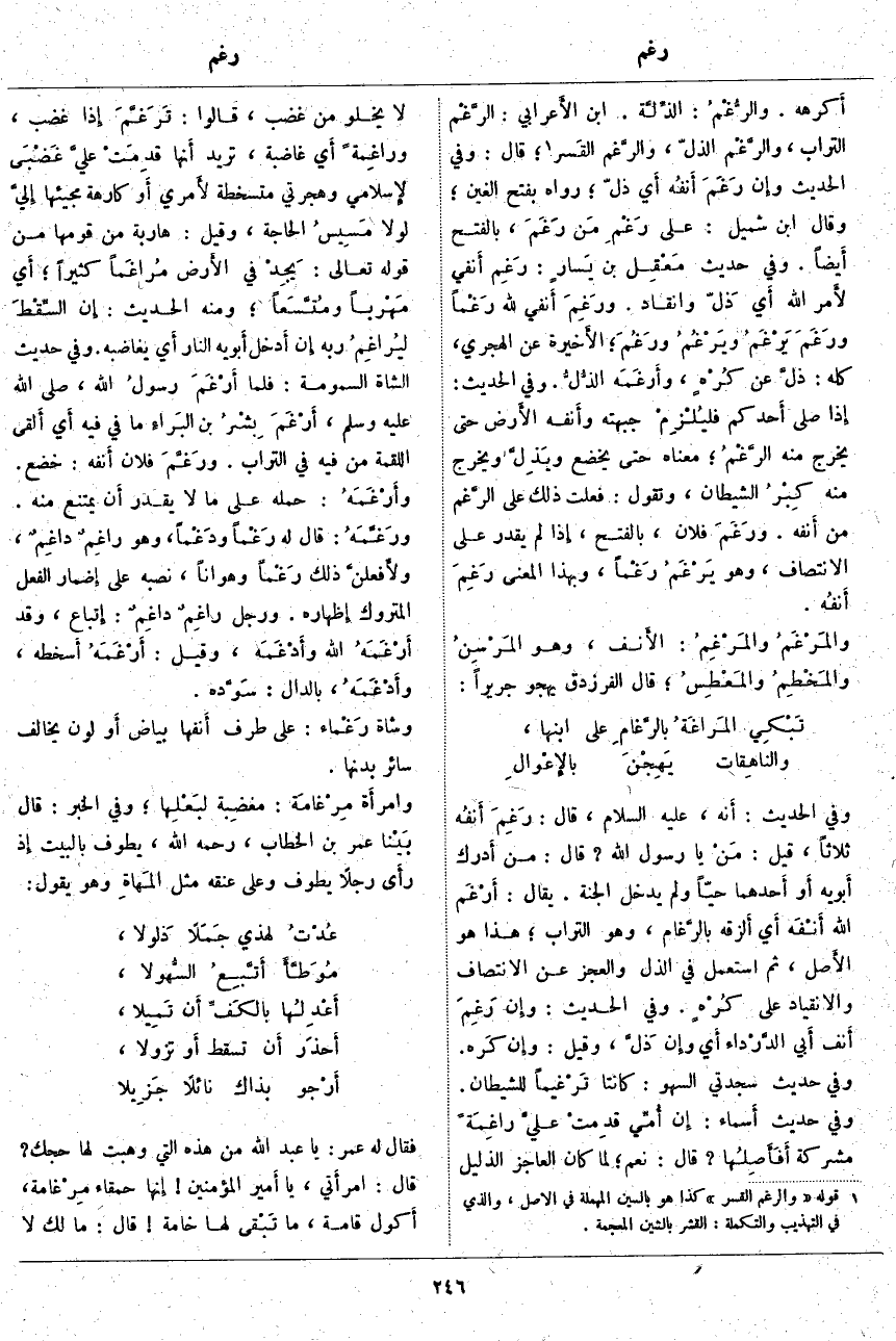 ؛ مَعْنَاهُ حَتَّى يَخْضَعَ ويَذِلَّ وَيَخْرُجَ مِنْهُ كِبْرُ الشَّيْطَانِ، وَتَقُولَ: فَعَلْتُ ذَلِكَ عَلَى الرَّغم مِنْ أَنفه. ورَغَمَ فُلَانٌ، بِالْفَتْحِ، إِذا لَمْ يَقْدِرْ عَلَى الِانْتِصَافِ، وَهُوَ يَرْغَمُ رَغْماً، وَبِهَذَا الْمَعْنَى رَغِمَ أَنفُه. والمَرْغَمُ والمَرْغِمُ: الأَنف، وَهُوَ المَرْسِنُ والمَخْطِمُ والمَعْطِسُ؛ قَالَ الْفَرَزْدَقُ يَهْجُو جَرِيرًا: