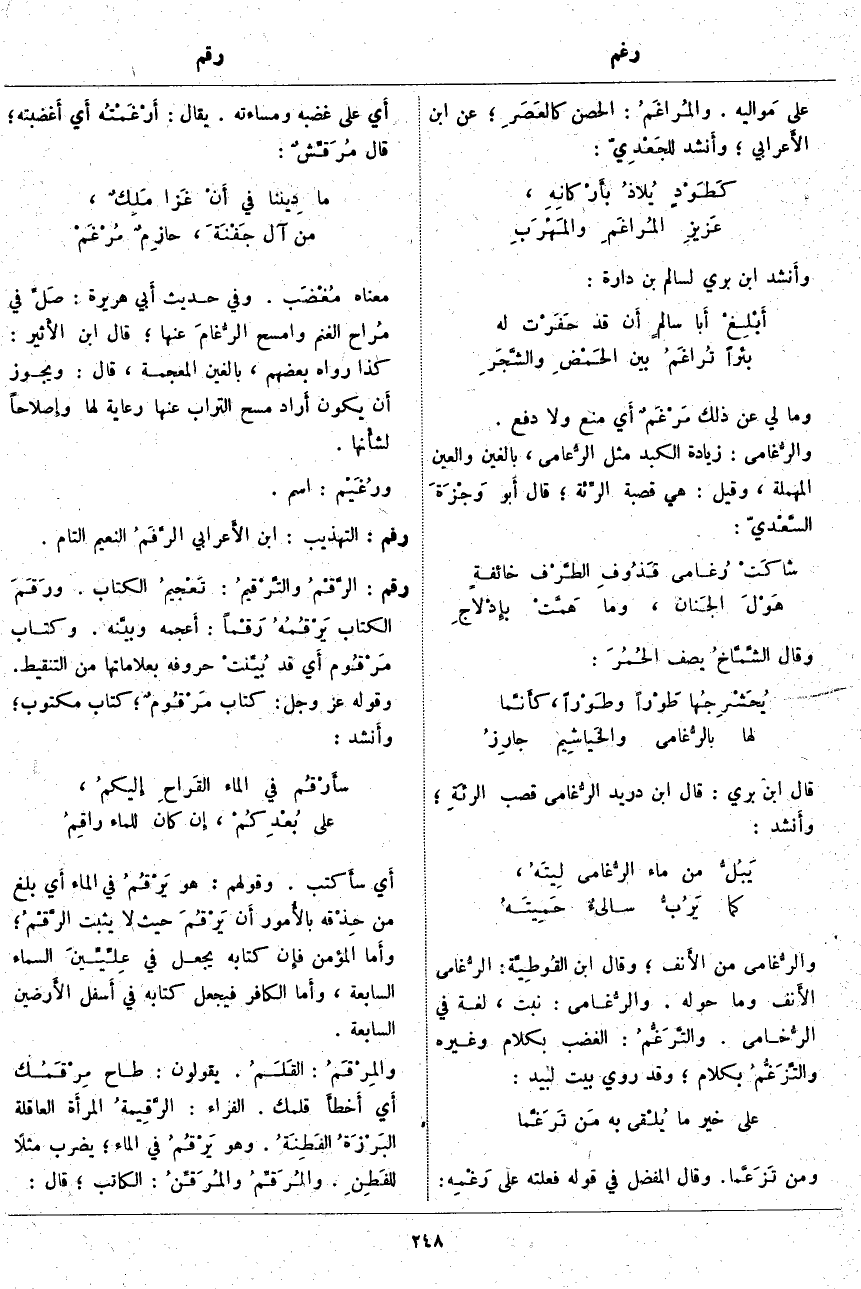 رقم: الرَّقْمُ والتَّرقيمُ: تَعْجيمُ الْكِتَابِ. ورَقَمَ الْكِتَابَ يَرْقُمُهُ رَقْماً: أَعجمه وبيَّنه. وَكِتَابٌ مَرْقُوم أَي قَدْ بُيِّنتْ حُرُوفُهُ بِعَلَامَاتِهَا مِنَ التَّنْقِيطِ. وَقَوْلُهُ عَزَّ وَجَلَّ: كِتابٌ مَرْقُومٌ*