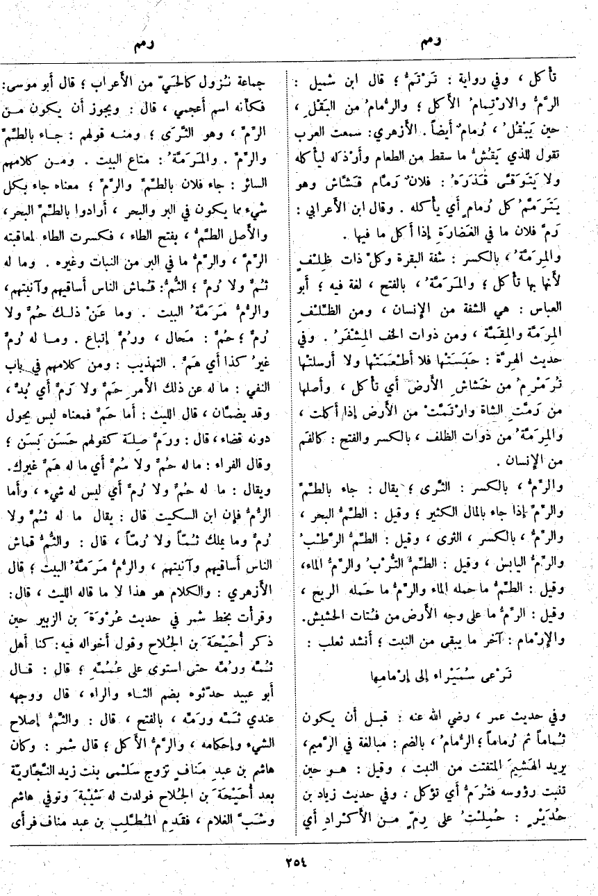 ؛ قَالَ: أَبو عُبَيْدٍ حَدَّثُوهُ بِضَمِّ الثَّاءِ وَالرَّاءِ، قَالَ وَوَجْهُهُ عِنْدِي ثَمِّه ورَمِّه، بِالْفَتْحِ، قَالَ: والثَّمُّ إِصلاح الشَّيْءِ وإِحكامه، والرَّمُّ الأَكل؛