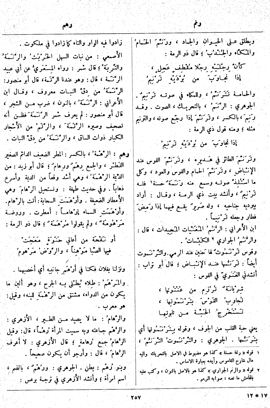 (2). قوله [والرنم الجواري] كذا هو بالأَصل بالنون، وكتب عليه بالهامش ما نصه: صوابه الرمم