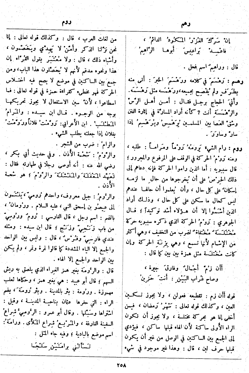 قَوْلُهُ أَأَن زُمَّ: تَقْطِيعُهُ فَعُولُنْ، وَلَا يَجُوزُ تَسْكِينُ الْعَيْنِ، وَكَذَلِكَ قَوْلُهُ تَعَالَى: شَهْرُ رَمَضانَ، فِيمَنْ أَخفى إِنما هُوَ بِحَرَكَةٍ مُخْتَلَسَةٍ، وَلَا يَجُوزُ أَن تَكُونَ الرَّاءُ الأُولى سَاكِنَةً لأَن الْهَاءَ قَبْلَهَا سَاكِنٌ، فَيُؤَدِّي إِلى الْجَمْعِ بَيْنَ السَّاكِنِينَ فِي الْوَصْلِ مِنْ غَيْرِ أَن يَكُونَ قَبْلَهَا حَرْفُ لِينٍ، قَالَ: وَهَذَا غَيْرُ مَوْجُودٍ فِي شَيْءٍ مِنْ لُغَاتِ الْعَرَبِ، قَالَ: وَكَذَلِكَ قَوْلُهُ تَعَالَى: إِنَّا نَحْنُ نَزَّلْنَا الذِّكْرَ وأَمَّنْ لا يَهِدِّي ويَخِصِّمُونَ، وأَشباه ذَلِكَ، قَالَ: وَلَا مُعْتَبَر بِقَوْلِ القُرَّاء إِن هَذَا وَنَحْوَهُ مُدْغَمٌ لأَنهم لَا يُحَصِّلون هَذَا الْبَابَ، وَمَنْ جَمَعَ بَيْنَ السَّاكِنِينَ فِي مَوْضِعٍ لَا يَصِحُّ فِيهِ اخْتِلَاسُ الْحَرَكَةِ فَهُوَ مُخْطِئٌ كقراءَة حَمْزَةَ فِي قَوْلِهِ تَعَالَى: فَمَا اسْطاعُوا، لأَنَّ سِينَ الِاسْتِفْعَالِ لَا يَجُوزُ تَحْرِيكُهَا بِوَجْهٍ مِنَ الْوُجُوهِ. قَالَ ابْنُ سِيدَهْ: والمَرامُ المَطْلَبُ. ابْنُ الأَعرابي: رَوَّمْتُ فُلَانًا ورَوَّمْتُ بِفُلَانٍ إِذا جَعَلْتَهُ يَطْلُبُ الشَّيْءَ. والرامُ: ضَرْبٌ مِنَ الشَّجَرِ. والرَّوْمُ: شَحْمة الأُذن. وَفِي حَدِيثِ