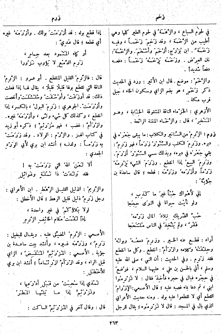 زرم: الزَّرِمُ مِنَ السَّنانير وَالْكِلَابِ. مَا يَبْقَى جَعْرُه فِي دُبُرِهِ. وزَرِمَ الْكَلْبُ والسِّنَّوْرُ زَرَماً، فَهُوَ زَرِمٌ: بَقِيَ جَعْرُه فِي دُبُرِهِ، وَبِذَلِكَ سُمِّيَ السِّنَّوْرُ أَزْرَمَ. وزَرِمَ البيعُ إِذا انْقَطَعَ. وزَرَمَ الشيءَ يَزْرِمُهُ زَرْماً. وأَزْرَمهُ وزَرَّمَه: قَطَعَهُ؛ قَالَ سَاعِدَةُ بْنُ جُؤَيَّةَ: