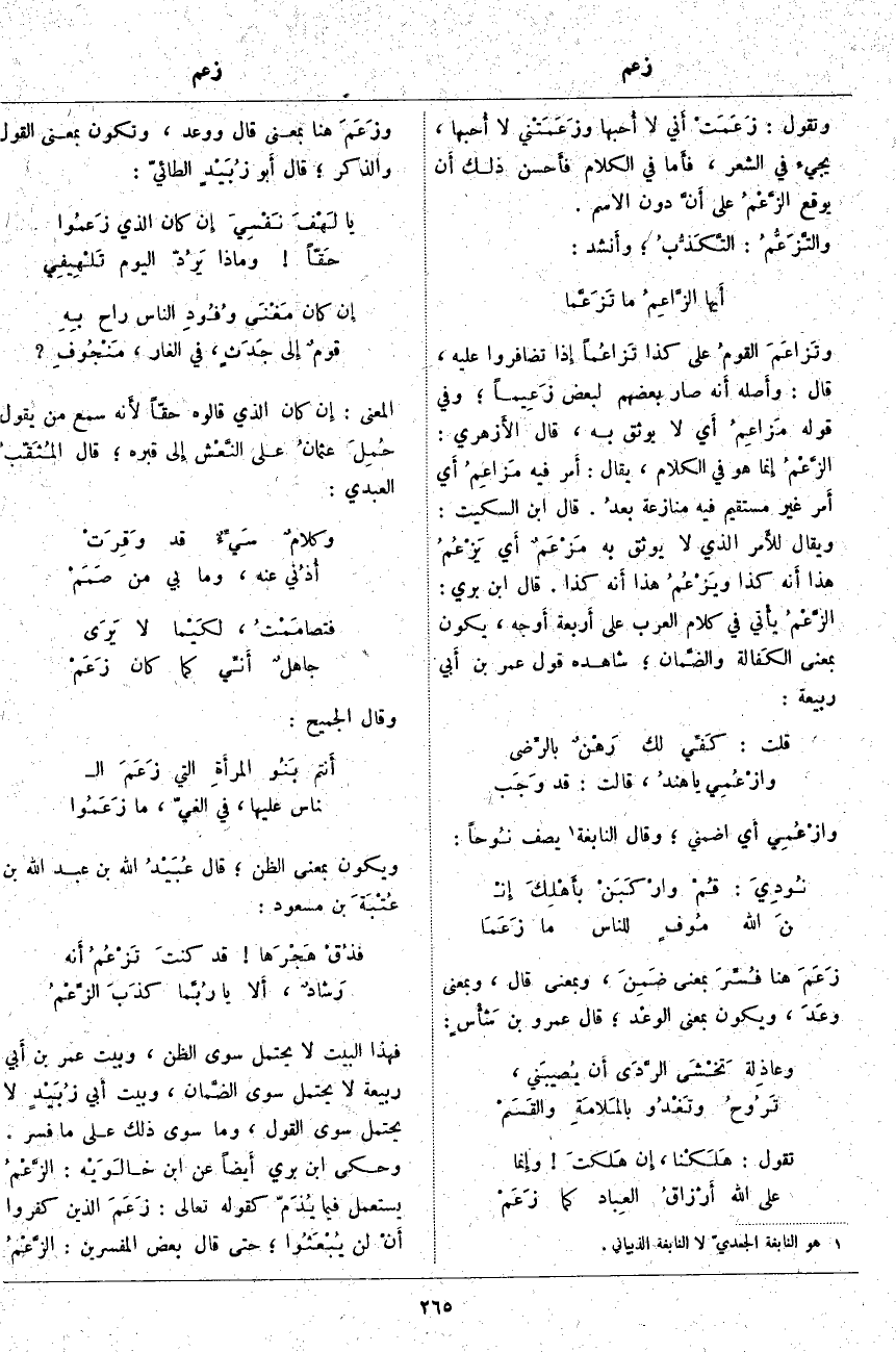 فَهَذَا الْبَيْتُ لَا يَحْتَمِلُ سِوَى الظَّنِّ، وَبَيْتُ عُمَرُ بْنُ أَبي رَبِيعَةَ لَا يَحْتَمِلُ سِوَى الضَّمان، وَبَيْتُ أَبي زُبَيْدٍ لَا يَحْتَمِلُ سِوَى الْقَوْلِ، وَمَا سِوَى ذَلِكَ عَلَى مَا فُسِّرَ. وَحَكَى ابْنُ بَرِّيٍّ أَيضاً عَنِ ابْنِ خالَوَيْه: الزَّعْمُ يُسْتَعْمَلُ فِيمَا يُذَمّ كَقَوْلِهِ تَعَالَى: زَعَمَ الَّذِينَ كَفَرُوا أَنْ لَنْ يُبْعَثُوا