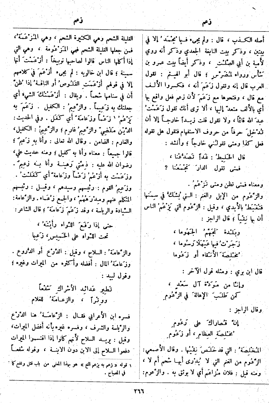 أَصله الْكَذِبُ، قَالَ: وَلَمْ يَجِئْ فِيمَا يُحْمَدُ إِلا فِي بَيْتَيْنِ، وَذَكَرَ بَيْتَ النَّابِغَةِ الْجَعْدِيِّ وَذَكَرَ أَنه رُوِيَ لأُمية بْنِ أَبي الصَّلْتِ، وَذَكَرَ أَيضاً بَيْتَ عَمْرِو بْنِ شَأْس وَرَوَاهُ لمُضَرِّسٍ؛ قَالَ أَبو الْهَيْثَمِ: تَقُولُ الْعَرَبُ قَالَ إِنه وَتَقُولُ زَعَمَ أَنه، فَكَسَرُوا الأَلف مَعَ قَالَ، وَفَتَحُوهَا مَعَ زَعَمَ لأَن زَعَمَ فِعْلٌ وَاقِعٌ بِهَا أَي بالأَلف مُتَعَدٍّ إِليها، أَلا تَرَى أَنك تَقُولُ زَعَمْتُ عبدَ اللَّهِ قَائِمًا، وَلَا تَقُولُ قُلْتُ زَيْدًا خَارِجًا إِلا أَن تُدْخِلَ حَرْفًا مِنْ حُرُوفِ الِاسْتِفْهَامِ فَتَقُولُ هَلْ تَقُولُهُ فَعَلَ كَذَا وَمَتَّى تقولُني خَارِجًا؛ وأَنشد: