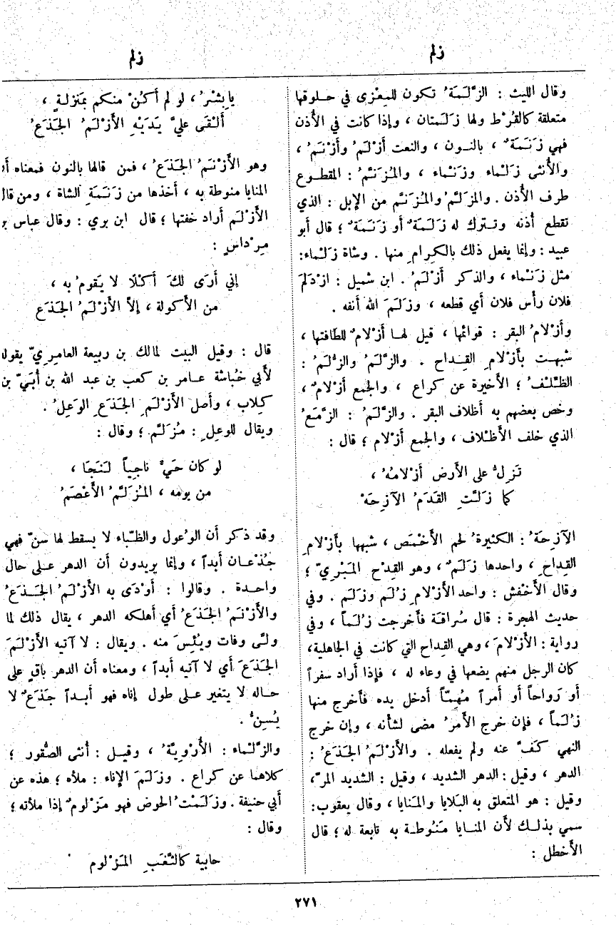 وَقَدْ ذَكَرَ أَن الوُعول وَالظِّبَاءَ لَا يَسْقُطُ لَهَا سِنٌّ فَهِيَ جُذْعان أَبداً، وإِنما يُرِيدُونَ أَن الدَّهْرَ عَلَى حَالٍ وَاحِدَةٍ. وَقَالُوا: أَوْدَى بِهِ الأَزْلَمُ الجَذَعُ والأَزْنَمُ الجَذَعُ أَي أَهلكه الدَّهْرُ، يُقَالُ ذَلِكَ لِمَا ولَّى وَفَاتَ ويُئِسَ مِنْهُ. وَيُقَالُ: لَا آتِيهِ الأَزْلَمَ الجَذَعَ أَي لَا آتِيهِ أَبداً، وَمَعْنَاهُ أَن الدَّهْرَ باقٍ عَلَى حَالِهِ لَا يَتَغَيَّرُ عَلَى طُولِ إِناه فَهُوَ أَبداً جَذَعٌ لَا يُسِنُّ. والزَّلْماء: الأُرْوِيَّةُ، وَقِيلَ: أُنثى الصُّقور؛ كِلَاهُمَا عَنْ كُرَاعٍ. وزَلَمَ الإِناء: ملأَه؛ هَذِهِ عَنْ أَبي حَنِيفَةَ. وزَلَمْتُ الْحَوْضَ فَهُوَ مَزْلومٌ إِذا مَلَأْتَهُ؛ وَقَالَ: