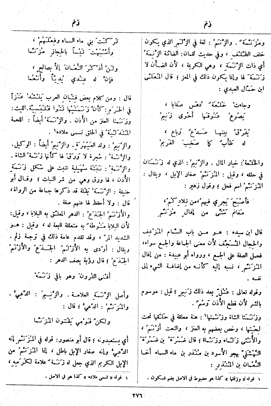 ؛ قِيلَ: مَوْسُومٌ بِالشَّرِّ لأَن قَطْعَ الأُذن وَسْمٌ. وزَنَمَتا الشَّاةِ وزُنْمتها «4»: هَنَةٌ مُعَلَّقَةٌ فِي حَلْقها تَحْتَ لِحْيتها، وَخَصَّ بَعْضُهُمْ بِهِ الْعَنْزَ، وَالنَّعْتُ أَزْنَمُ، والأُنْثى زَلْماء وزَنْماءُ؛ قَالَ ضَمْرَةُ بْنُ ضَمْرَةَ النَّهْشَليّ يَهْجُو الأَسود بْنَ مُنْذر بْنِ مَاءِ السَّمَاءِ أَخا النُّعْمان بْنِ المُنْذِرِ: