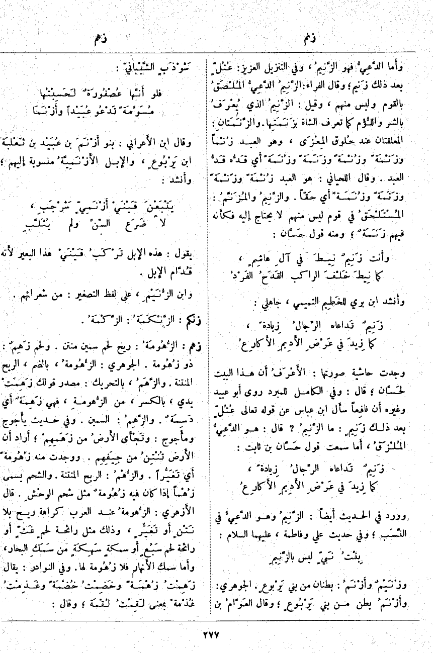زهم: الزُّهُومَةُ: رِيحُ لَحْمٍ سَمِينٍ مُنْتِنٍ. وَلَحْمٌ زَهِمٌ: ذُو زُهُومة. الْجَوْهَرِيُّ: الزُّهُومةُ، بِالضَّمِّ، الرِّيحُ الْمُنْتِنَةُ. والزَّهَمُ، بِالتَّحْرِيكِ: مَصْدَرُ قَوْلِكَ زَهِمَتْ يَدِي، بِالْكَسْرِ، مِنَ الزُّهومةِ، فَهِيَ زَهِمَةٌ أَي دَسِمَةٌ. والزَّهِمُ: السَّمِينُ. وَفِي حَدِيثِ