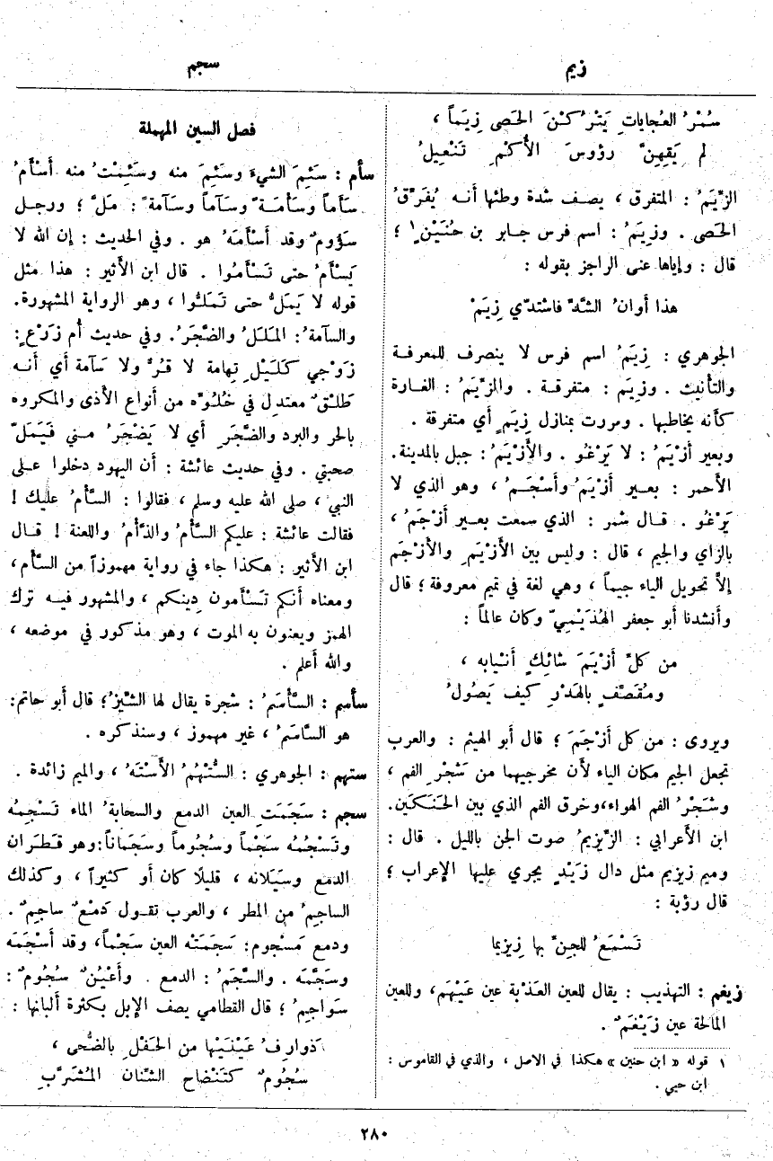 سجم: سَجَمَتِ الْعَيْنُ الدَّمْعَ والسحابةُ الْمَاءَ تَسْجِمُه وتَسْجُمُه سَجْماً وسُجُوماً وسَجَماناً: وَهُوَ قَطَران الدَّمْعِ وسَيَلانه، قَلِيلًا كَانَ أَو كَثِيرًا، وكذلك الساجِمُ مِنَ الْمَطَرِ، وَالْعَرَبُ تَقُولُ دَمْعٌ ساجِمٌ. وَدَمْعٌ مَسْجوم: سَجَمَتْه الْعَيْنُ سَجْماً، وقد أَسْجَمَه وسَجَّمَه. والسَّجَمُ: الدَّمْعُ. وأَعْيُنٌ سُجُومٌ: سَواجِمُ؛ قَالَ الْقُطَامِيُّ يَصِفُ الإِبل بِكَثْرَةِ أَلبانها: