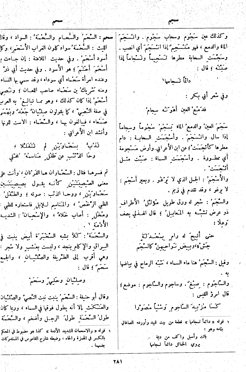 ثُمَّ فَسَّرَهُمَا فَقَالَ: السَّحْماوان هُمَا القَرْنانِ، وأَنث عَلَى مَعْنَى الصِّيصِيَتَيْنِ كأَنه يَقُولُ بصِيصِيَتَينِ سَحْماوَيْنِ، وَوَحَا الذِّئْبُ: صَوْتُهُ؛ والطَّفْلُ: الظَّبْيُ الرَّخْصُ، والمَناسِم للإِبلِ فَاسْتَعَارَهُ لِلظَّبْيِ، ومُخْلٍ: أَصاب خَلاءً، والإِسْحِمانُ: الشَّدِيدُ الأُدْمَةِ «2». والسَّحَمَةُ: كَلأَ يُشْبِهُ السَّخْبَرَة أَبيض يَنْبُتُ فِي البِراقِ والإِكامِ بِنَجْدٍ، وَلَيْسَتْ بعُشبٍ وَلَا شَجَرٍ، وَهِيَ أَقرب إِلى الطَّريفة والصِّلِّيانِ، وَالْجَمْعُ سَحَمٌ؛ قَالَ: