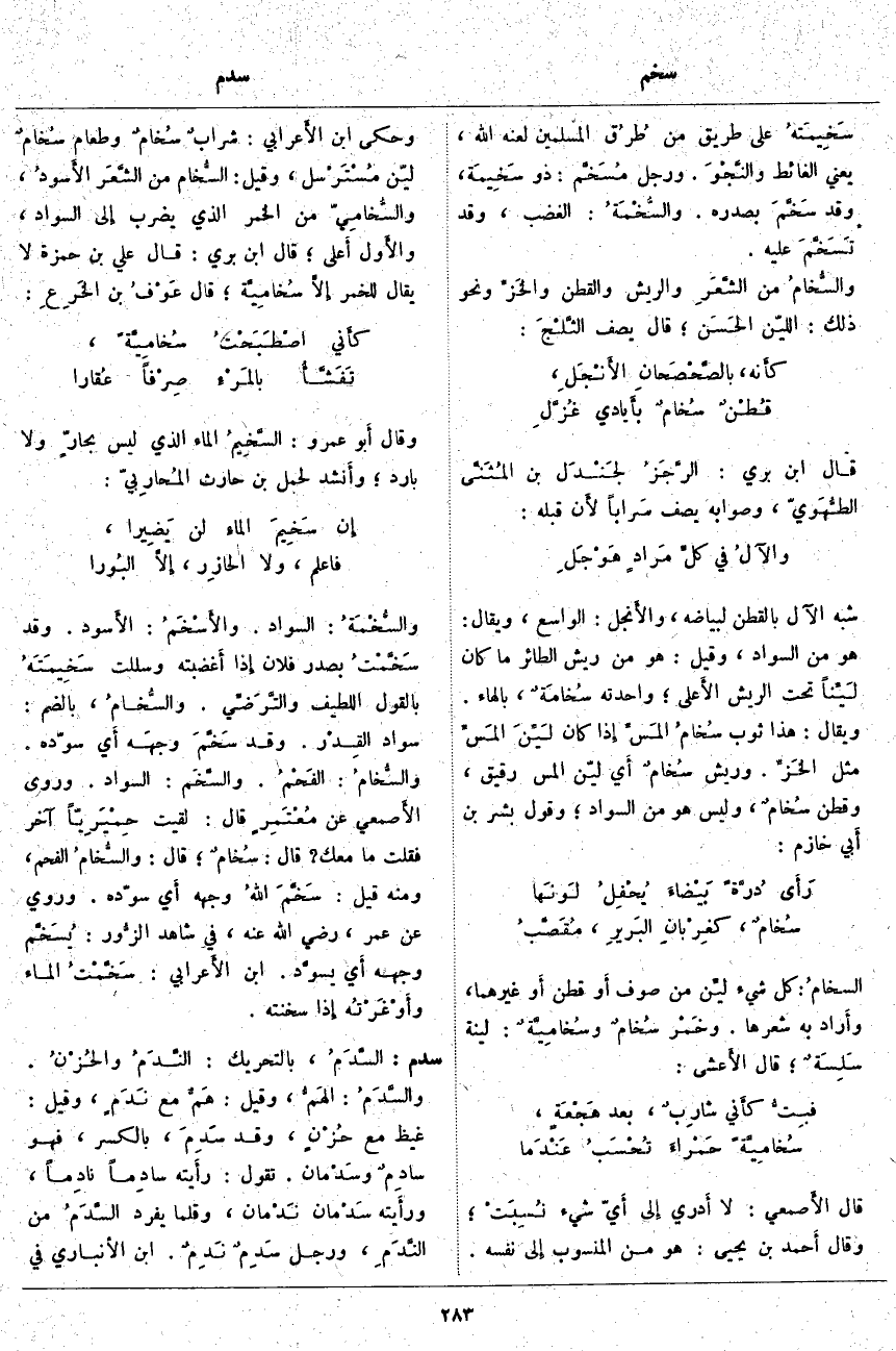 سدم: السَّدَمُ، بِالتَّحْرِيكِ: النَّدَمُ والحُزْنُ. والسَّدَمُ: الهَمُّ، وَقِيلَ: هَمٌّ مَعَ نَدَمٍ، وَقِيلَ: غَيْظٌ مَعَ حُزْنٍ، وَقَدْ سَدِمَ، بِالْكَسْرِ، فَهُوَ سادِمٌ وسَدْمان. تَقُولُ: رأَيته سادِماً نادِماً، ورأَيته سَدْمان نَدْمان، وَقَلَّمَا يُفْرَدُ السَّدَمُ مِنَ النَّدَمِ، وَرَجُلٌ سَدِمٌ نَدِمٌ. ابْنُ الأَنباري فِي