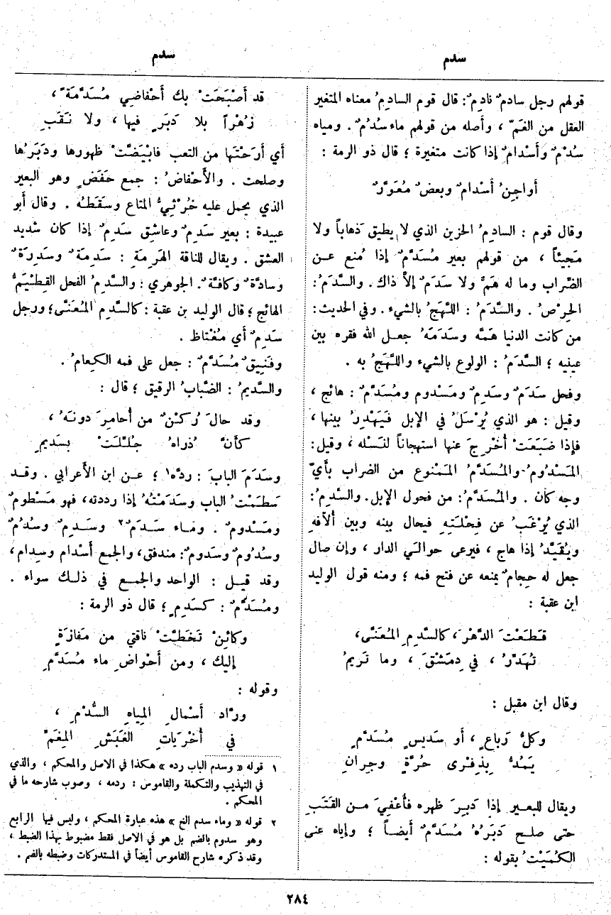 وسَدَمَ البابَ: ردَّه «1»؛ عَنِ ابْنِ الأَعرابي. وَقَدْ سَطَمْتُ الْبَابَ وسَدَمْتُهُ إِذا رَدَدْتُهُ، فَهُوَ مَسْطومٌ ومَسْدومٌ. وَمَاءٌ سَدَمٌ «2» وسَدِمٌ وسُدُمٌ وسُدُومٌ وسَدومٌ: مُنْدَفِقٌ، وَالْجَمْعُ أَسْدام وسِدام، وَقَدْ قِيلَ: الْوَاحِدُ وَالْجَمْعُ فِي ذَلِكَ سَوَاءٌ. ومُسَدَّمٌ: كسَدِمٍ؛ قَالَ ذُو الرُّمَّةِ: