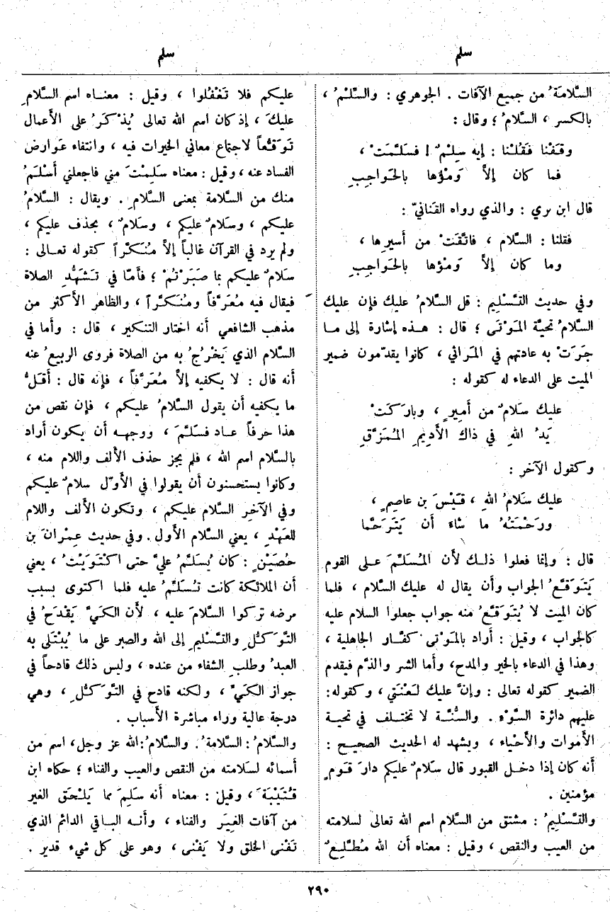، فإِن نَقَصَ مِنْ هَذَا حَرْفًا عَادَ فسَلَّمَ، وَوَجْهُهُ أَن يَكُونَ أَراد بالسَّلام اسْمَ اللَّه، فَلَمْ يَجُزْ حَذْفُ الأَلف وَاللَّامِ مِنْهُ، وَكَانُوا يَسْتَحْسِنُونَ أَن يَقُولُوا فِي الأَوّل سلامٌ عَلَيْكُمْ وَفِي الآخِر السَّلام عَلَيْكُمْ، وَتَكُونُ الأَلف وَاللَّامُ للعَهْدِ، يَعْنِي السَّلام الأَول. وَفِي حَدِيثِ