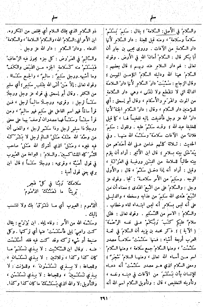 «2»، ذَكَرَ مُحَمَّدُ بْنُ يَزِيدَ أَن السَّلامَ فِي لُغَةِ الْعَرَبِ أَربعة أَشياء: فَمِنْهَا سَلَّمْتُ سَلاما مَصْدَرُ سَلَّمْتُ، وَمِنْهَا السَّلامُ جَمْعُ سَلامة، وَمِنْهَا السَّلامُ اسْمٌ مِنْ أَسماء اللَّه تَعَالَى، وَمِنْهَا السلامُ شَجَرٌ، وَمَعْنَى السَّلام الَّذِي هُوَ مَصْدَرُ سَلَّمْتُ أَنه دُعَاءٌ للإِنسان بأَن يَسْلَمَ مِنَ الْآفَاتِ فِي دِينِهِ وَنَفْسِهِ، وتأْويله التَّخْلِيصُ، قَالَ: وتأْويل السَّلام اسْمُ اللَّه أَنه ذُو السَّلامِ الَّذِي يَمْلِكُ السَّلَامَ أَي يُخَلِّصُ مِنَ الْمَكْرُوهِ. ابْنُ الأَعرابي: السَّلام اللَّه، والسَّلامُ السلامةُ، والسَّلامةُ الدُّعَاءُ. ودارُ السَّلَامِ: دَارُ اللَّه عَزَّ وَجَلَّ. والسَّالِمُ فِي العَرُوض: كُلُّ جُزْءٍ يَجُوزُ فِيهِ الزِّحافُ فَيَسْلَمُ مِنْهُ كَسَلامةِ الْجَزْءِ مِنَ القَبْض والكَفِّ وَمَا أَشبهه. وَرَجُلٌ سَلِيمٌ: سَالِمٌ، وَالْجَمْعُ سُلَماءُ. وَقَوْلُهُ تَعَالَى: إِلَّا مَنْ أَتَى اللَّهَ بِقَلْبٍ سَلِيمٍ