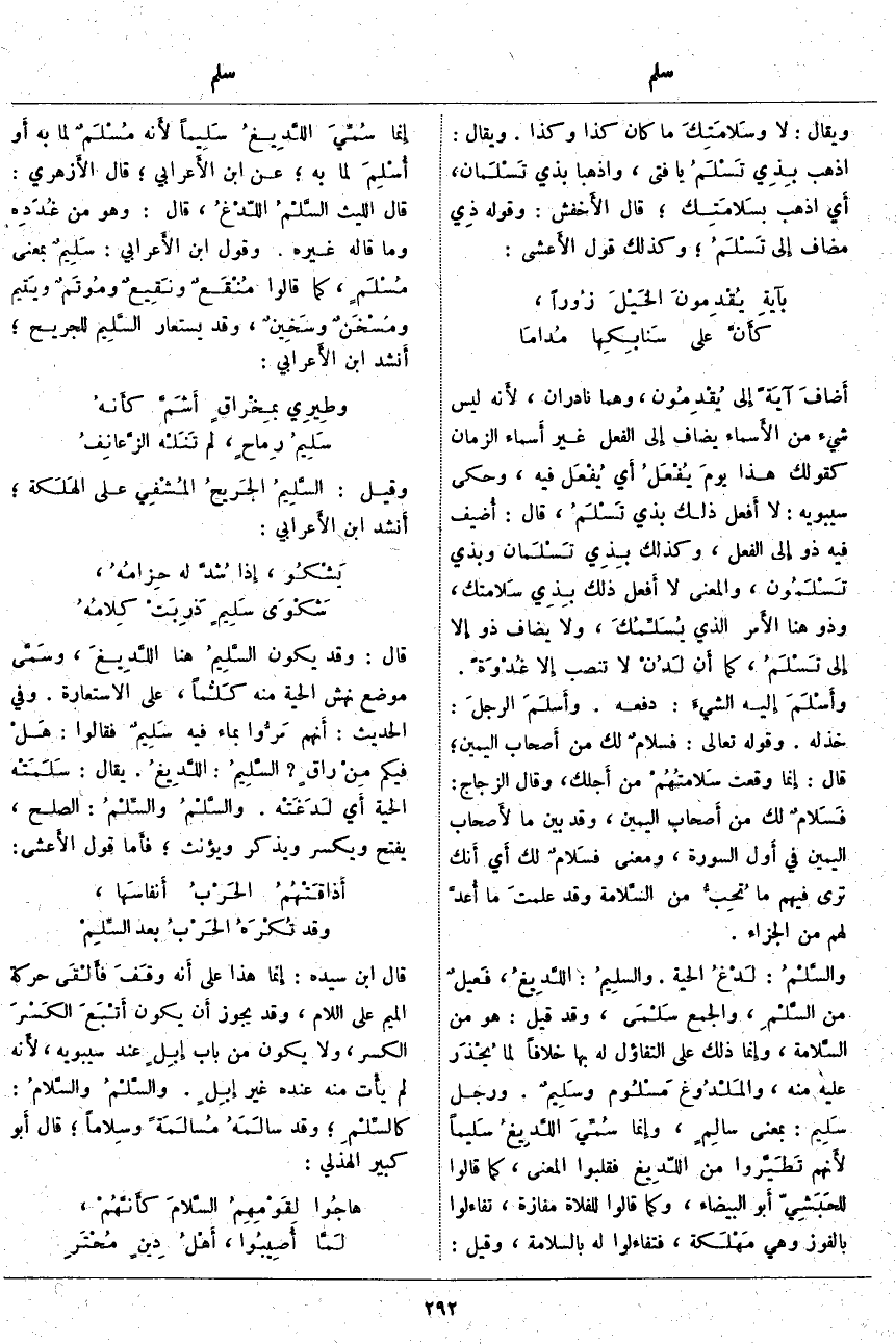 أَي أَنك تَرَى فِيهِمْ مَا تُحِبُّ مِنَ السَّلامة وَقَدْ علمتَ مَا أُعدَّ لَهُمْ مِنَ الْجَزَاءِ. والسَّلْمُ: لَدْغُ الْحَيَّةِ. والسلِيمُ: اللَّدِيغُ، فَعيلٌ مِنَ السَّلْمِ، وَالْجَمْعُ سَلْمَى، وَقَدْ قِيلَ: هُوَ مِنَ السَّلامة، وإِنما ذَلِكَ عَلَى التَّفَاؤُلِ لَهُ بِهَا خِلَافًا لِمَا يُحْذَر عَلَيْهِ مِنْهُ، والمَلْدُوغ مَسْلُوم وسَلِيمٌ. وَرَجُلٌ سَلِيم: بِمَعْنَى سالِمٍ، وإِنما سُمِّيَ اللَّدِيغُ سَليما لأَنهم تَطَيَّروا مِنَ اللَّدِيغ فَقَلَبُوا الْمَعْنَى، كَمَا قَالُوا للحَبَشِيّ أَبو الْبَيْضَاءِ، وَكَمَا قَالُوا لِلْفَلَاةِ مَفَازَةٌ، تَفَاءَلُوا بِالْفَوْزِ وَهِيَ مَهْلَكة، فَتَفَاءَلُوا لَهُ بِالسَّلَامَةِ، وَقِيلَ: إِنما سُمِّيَ اللَّدِيغُ سَلِيماً لأَنه مُسْلَمٌ لِمَا بِهِ أَو أُسْلِمَ لِمَا بِهِ، عَنِ ابْنِ الأَعرابي، قَالَ الأَزهري: قَالَ اللَّيْثُ السَّلْمُ اللَّدْغُ، قَالَ: وَهُوَ مِنْ غُدَدِه وَمَا قَالَهُ غَيْرُهُ. وَقَوْلُ ابْنِ الأَعرابي: سَلِيمٌ بِمَعْنَى مُسْلَمٍ، كَمَا قَالُوا مُنْقَعٌ ونَقِيعٌ ومُوتَمٌ ويَتيم ومُسْخَنٌ وسَخِينٌ، وَقَدْ يُسْتَعَارُ السَّلِيم لِلْجَرِيحِ، أَنشد ابْنُ الأَعرابي: