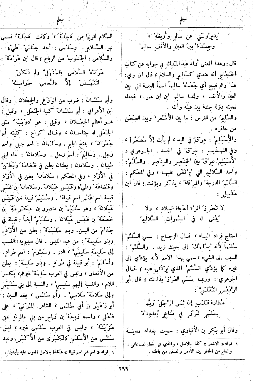 قَالَ: وَهَذَا الْمَعْنَى أَراد عَبْدُ المَلِكِ فِي جَوَابِهِ عَنْ كِتَابِ الحَجَّاجِ أَنه عِنْدِي كَسَالِمٍ وَالسَّلَامِ، قَالَ ابْنُ بَرِّيٍّ: هَذَا وَهْمٌ قَبِيحٌ أَي جَعْلُهُ سالِماً اسْمًا لِلْجِلْدَةِ الَّتِي بَيْنَ الْعَيْنِ والأَنف، وإِنما سالِم ابْنُ ابْنِ عُمَرَ، فَجَعَلَهُ لِمَحَبَّتِهِ بِمَنْزِلَةِ جِلْدَةٍ بَيْنَ عَيْنِهِ وأَنفه. والسَّلِيمُ مِنَ الْفَرَسِ: مَا بَيْنَ الأَشْعر «1» وَبَيْنَ الصَّحْن مِنْ حَافِرِهِ. والأُسَيْلِمُ: عِرْقٌ فِي الْيَدِ، لَمْ يأْت إِلَّا مُصَغَّراً، وَفِي التهذيبِ: عِرْقٌ فِي الْجَسَدِ. الْجَوْهَرِيُّ: الأُسَيْلِمُ عِرْقٌ بَيْنَ الخِنْصِرِ والبِنْصِر. والسُّلَّمُ: وَاحِدُ السَّلالِيمِ الَّتِي يُرْتَقَى عَلَيْهَا، وَفِي الْمُحْكَمِ: السُّلَّمُ الدرجةُ والمِرقاةُ، يُذَكَّرُ وَيُؤَنَّثُ، قَالَ ابْنُ مُقْبِلٍ: