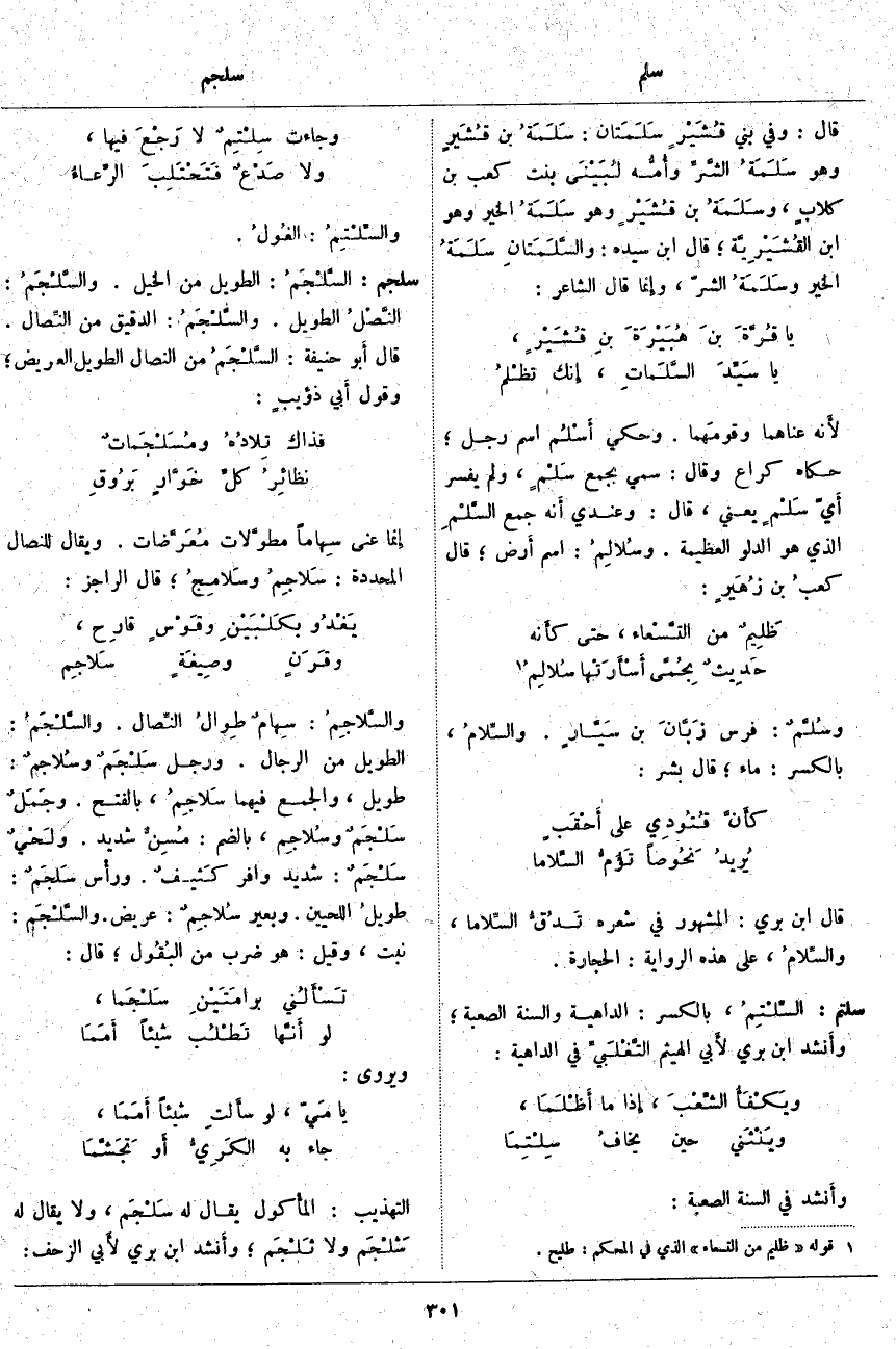 سلجم: السَّلْجَمُ: الطَّوِيلُ مِنَ الْخَيْلِ. والسَّلْجَمُ: النَّصْلُ الطَّوِيلُ. والسَّلْجَمُ: الدَّقِيقُ مِنَ النِّصال. قَالَ أَبو حَنِيفَةَ: السَّلْجَمُ مِنَ النِّصَالِ الطَّوِيلُ الْعَرِيضُ؛ وَقَوْلُ أَبي ذؤيبٍ: