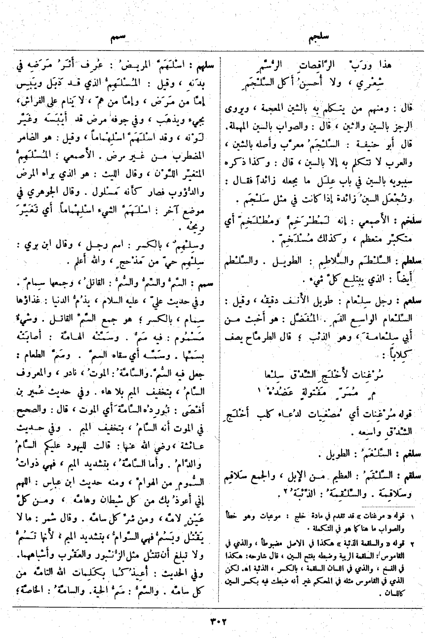 قَالَ: وَمِنْهُمْ مَنْ يَتَكَلَّمُ بِهِ بِالشِّينِ الْمُعْجَمَةِ، وَيُرْوَى الرَّجَزُ بِالسِّينِ وَالشِّينِ، قَالَ: وَالصَّوَابُ بِالسِّينِ الْمُهْمَلَةِ. قَالَ أَبو حَنِيفَةَ: السَّلْجَمُ معرَّب وأَصله بِالشِّينِ، وَالْعَرَبُ لَا تَتَكَلَّمُ بِهِ إِلا بِالسِّينِ، قَالَ: وَكَذَا ذَكَرَهُ سِيبَوَيْهِ بِالسِّينِ فِي بَابِ عِلَل مَا يَجْعَلُهُ زَائِدًا فَقَالَ: وتُجْعَل السينُ زَائِدَةً إِذا كَانَتْ فِي مِثْلِ سَلْجَم.