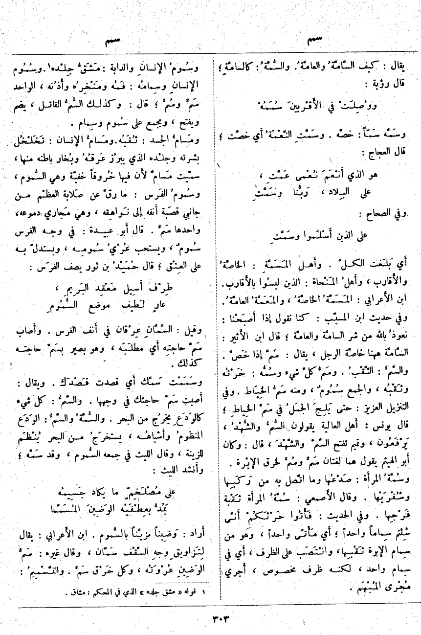 ؛ أَي مَأْتىً وَاحِدًا، وَهُوَ مِنْ سِمام الإِبرة ثَقْبِها، وانْتَصَب عَلَى الظَّرْفِ، أَي فِي سِمام وَاحِدٍ، لَكِنَّهُ ظَرْفٌ مَخْصُوصٌ، أُجري مُجْرى المُبْهَم. وسُمومُ الإِنسانِ وَالدَّابَّةِ: مَشَقُّ جِلْده «1». وسُمُوم الإِنسانِ وسِمامُه: فَمُه ومَنْخِرُه وأُذنُه، الْوَاحِدُ سَمٌّ وسُمٌّ؛ قَالَ: وَكَذَلِكَ السُّمُّ الْقَاتِلُ، يُضَمُّ وَيُفْتَحُ، وَيُجْمَعُ عَلَى سُموم وسِمام. ومَسامُّ الْجَسَدِ: ثُقَبُه. ومَسامُّ الإِنسان: تَخَلْخُل بَشَرَتِهِ وجلْده الَّذِي يبرُزُ عَرقُهُ وبُخار بَاطِنِهِ مِنْهَا، سمِّيت مَسامَّ لأَن فِيهَا خُروقاً خَفِيَّةً وَهِيَ السُّموم، وسُمومُ الفَرس: مَا رقَّ عَنْ صَلابة العظْم مِنْ جَانِبَيْ قصَبة أَنفه إِلى نَواهِقه، وَهِيَ مَجاري دُمُوعِهِ، وَاحِدُهَا سَمٌّ. قَالَ أَبو عُبَيْدَةَ: فِي وَجْهِ الْفَرَسِ سُمومٌ، وَيُسْتَحَبُّ عُرْيُ سُمومِه، وَيُسْتَدَلُّ بِهِ عَلَى العِتْق؛ قَالَ حُمَيْدُ بْنُ ثَوْرٍ يَصِفُ الفرَس: