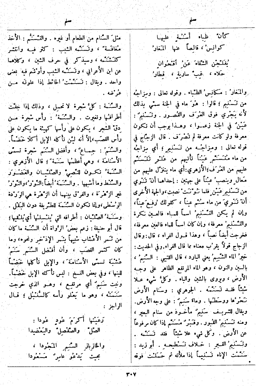 يَعْنِي الْبَارِدَ، قَالَ الْقُتَيْبِيُّ: السَّنِمُ، بِالسِّينِ وَالنُّونِ، وَهُوَ الْمَاءُ الْمُرْتَفِعُ الظَّاهِرُ عَلَى وَجْهِ الأَرض، وَيُرْوَى بِالشِّينِ وَالْبَاءِ. وكلُّ شَيْءٍ عَلَا شَيْئًا فَقَدْ تَسَنَّمَه. الجوهري: وسَنام الأَرض نَحْرُها ووسَطُها. وماءٌ سَنِمٌ: عَلَى وَجْهِ الأَرض. وَيُقَالُ لِلشَّرِيفِ سَنِيمٌ مأْخوذ مِنْ سَنَامِ الْبَعِيرِ، وَمِنْهُ تَسْنِيمُ القُبور. وقَبْرٌ مُسَنَّم إِذا كَانَ مَرْفُوعًا عَنِ الأَرض. وَكُلُّ شَيْءٍ عَلَا شَيْئًا فَقَدْ تَسَنَّمه. وتَسْنِيمُ القبرِ: خِلَافُ تَسْطيحهِ. أَبو زَيْدٍ: سَنَّمْت الإِناء تَسْنِيماً إِذا ملأْته ثُمَّ حَمَلْت فَوْقَهُ مثلَ السَّنام مِنَ الطَّعَامِ أَو غَيْرِهِ. والتَّسَنُّم: الأَخذ مُغافَسةً، وتَسَنَّمه الشَّيْبُ: كَثُرَ فِيهِ وَانْتَشَرَ كتَشَنَّمه، وَسَيُذْكَرُ فِي حَرْفِ الشِّينِ، وَكِلَاهُمَا عَنِ ابْنِ الأَعرابي، وتَسَنَّمه الشَّيْبُ وأَوْشَم فِيهِ بِمَعْنًى وَاحِدٍ. وَيُقَالُ: تَسَنَّمْتُ الْحَائِطَ إِذا علوتَه مِنْ عُرْضه. والسَّنَمة: كلُّ شَجَرَةٍ لَا تحمِل، وَذَلِكَ إِذا جفَّت أَطرافُها وَتَغَيَّرَتِ. والسَّنَمةُ: رأْس شَجَرَةٌ مِنْ دِقِّ الشَّجَرِ، يَكُونُ عَلَى رأْسها كَهَيْئَةِ مَا يَكُونُ عَلَى رأْس القصَب، إِلَّا أَنه ليِّن تأْكله الإِبل أَكلًا خَضْماً. والسَّنَمُ: جِماعٌ، وأَفضل السَّنَم شَجَرَةٌ تسمَّى الأَسْنامَة، وَهِيَ أَعظمُها سَنَمةً؛ قَالَ الأَزهري: السَّنَمةُ تَكُونُ للنَّصِيِّ والصِّلِّيان والغَضْوَر والسَّنْط وَمَا أَشبهها. والسَّنَمَةُ أَيضاً: النَّوْرُ، والنَّوْرُ غَيْرُ الزَّهْرَة، والفرْق بَيْنَهُمَا أَن الزَّهْرة هِيَ الوَرْدة الوُسْطى، وإِنما تَكُونُ السَّنَمَة للطَّريفة دُونَ البَقْل. وسَنَمةُ الصِّلِّيان: أَطرافه الَّتِي يُنْسِلُها أَي يُلْقيها؛ قَالَ أَبو حَنِيفَةَ: زَعَمَ بعضُ الرُّواة أَن السَّنَمة مَا كَانَ مِنْ ثَمر الأَعْشاب شَبِيهًا بثَمر الإِذْخِر وَنَحْوِهِ، وَمَا كَانَ كَثَمَرِ القصَب، وأَن أَفْضل السَّنَمِ سَنَمُ عُشْبَة تسمَّى الأَسْنامَةَ، والإِبل تأْكلها خَضْماً لِلِينِهَا، وَفِي بَعْضِ النُّسَخِ: لَيْسَ تأْكله الإِبل خَضْماً. وَنَبْتٌ سَنِمٌ أَي مرتفِع، وَهُوَ الَّذِي خَرَجَتْ سَنَمَتُه، وَهُوَ مَا يَعْلو رأْسه كالسُّنْبُل؛ قَالَ الرَّاجِزُ: