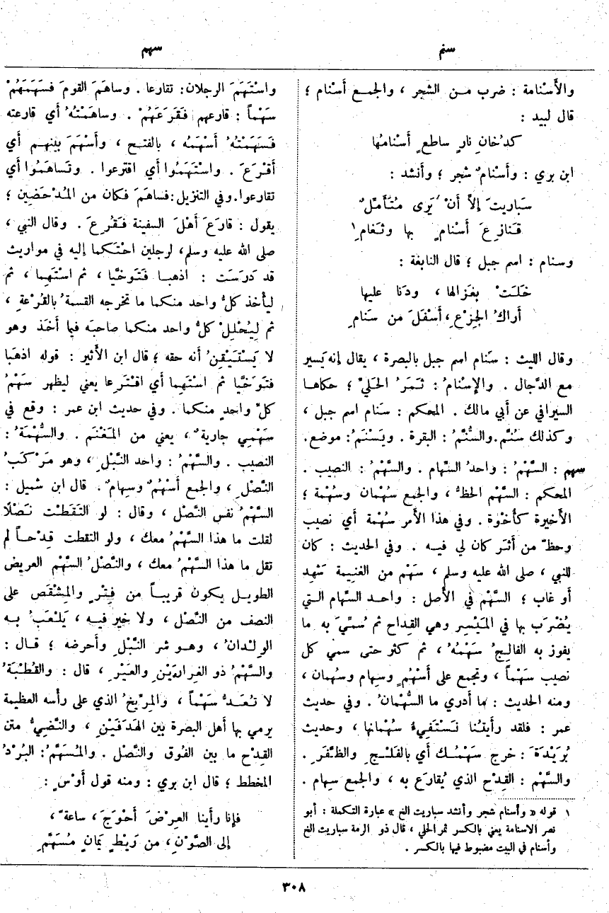 (2). قوله [وأَسنام شَجَرٌ وأَنشد سَبَارِيتَ إِلخ] عبارة التكملة: أَبو نصر الإسنامة يعني بالكسر ثمر الحلي، قَالَ ذُو الرُّمَّةِ سَبَارِيتُ إِلخ وأَسنام في البيت مضبوط فيها بالكسر
