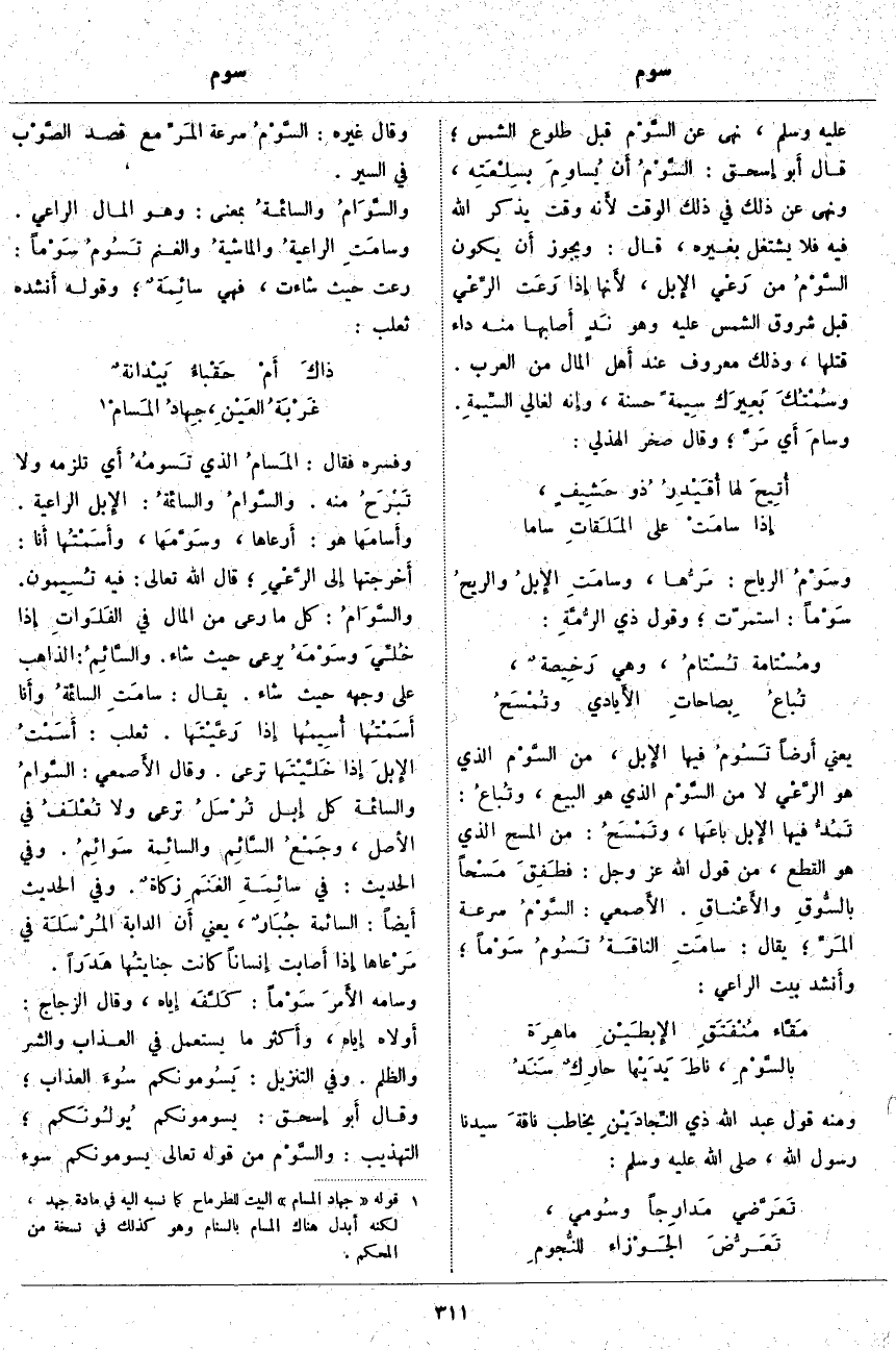 وَقَالَ غَيْرُهُ: السَّوْمُ سُرْعَةُ المَرِّ مَعَ قَصْدِ الصَّوْب فِي السَّيْرِ. والسَّوَامُ والسائمةُ بِمَعْنًى: وَهُوَ الْمَالُ الرَّاعِي. وسامَتِ الراعيةُ والماشيةُ وَالْغَنَمُ تَسُومُ سَوْماً: رَعَتْ حَيْثُ شَاءَتْ، فَهِيَ سائِمَةٌ؛ وَقَوْلُهُ أَنشده ثَعْلَبٌ: