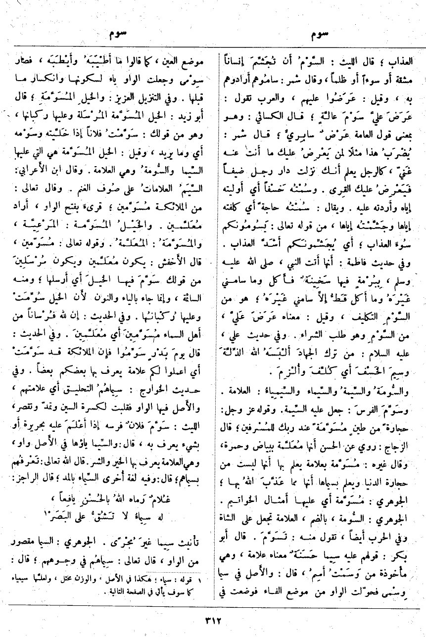 ، وَقَالَ غَيْرُهُ: مُسَوَّمة بِعَلَّامَةٍ يُعْلَمُ بِهَا أَنها لَيْسَتْ مِنْ حِجَارَةِ الدُّنْيَا وَيُعْلَمُ بِسِيمَاهَا أَنها مِمَّا عَذَّبَ اللهُ بِهَا؛ الْجَوْهَرِيُّ: مُسَوَّمة أَي عَلَيْهَا أَمثال الْخَوَاتِيمِ. الْجَوْهَرِيُّ: السُّومة، بِالضَّمِّ، الْعَلَامَةُ تُجْعَلُ عَلَى الشَّاةِ وَفِي الْحَرْبِ أَيضاً، تَقُولُ مِنْهُ: تَسَوَّمَ. قَالَ أَبو بَكْرٍ: قَوْلُهُمْ عَلَيْهِ سِيما حَسَنَةٌ مَعْنَاهُ عَلَامَةٌ، وَهِيَ مأُخوذة مِنْ وَسَمْتُ أَسِمُ، قَالَ: والأَصل فِي سِيَمَا وِسْمى فَحُوِّلَتِ الْوَاوُ مِنْ مَوْضِعِ الْفَاءِ فَوُضِعَتْ فِي مَوْضِعِ الْعَيْنِ، كَمَا قَالُوا مَا أَطْيَبَهُ وأَيْطَبَه، فَصَارَ سِوْمى وَجُعِلَتِ الْوَاوُ يَاءً لِسُكُونِهَا وَانْكِسَارِ مَا قَبْلَهَا. وَفِي التَّنْزِيلِ الْعَزِيزِ: وَالْخَيْلِ الْمُسَوَّمَةِ