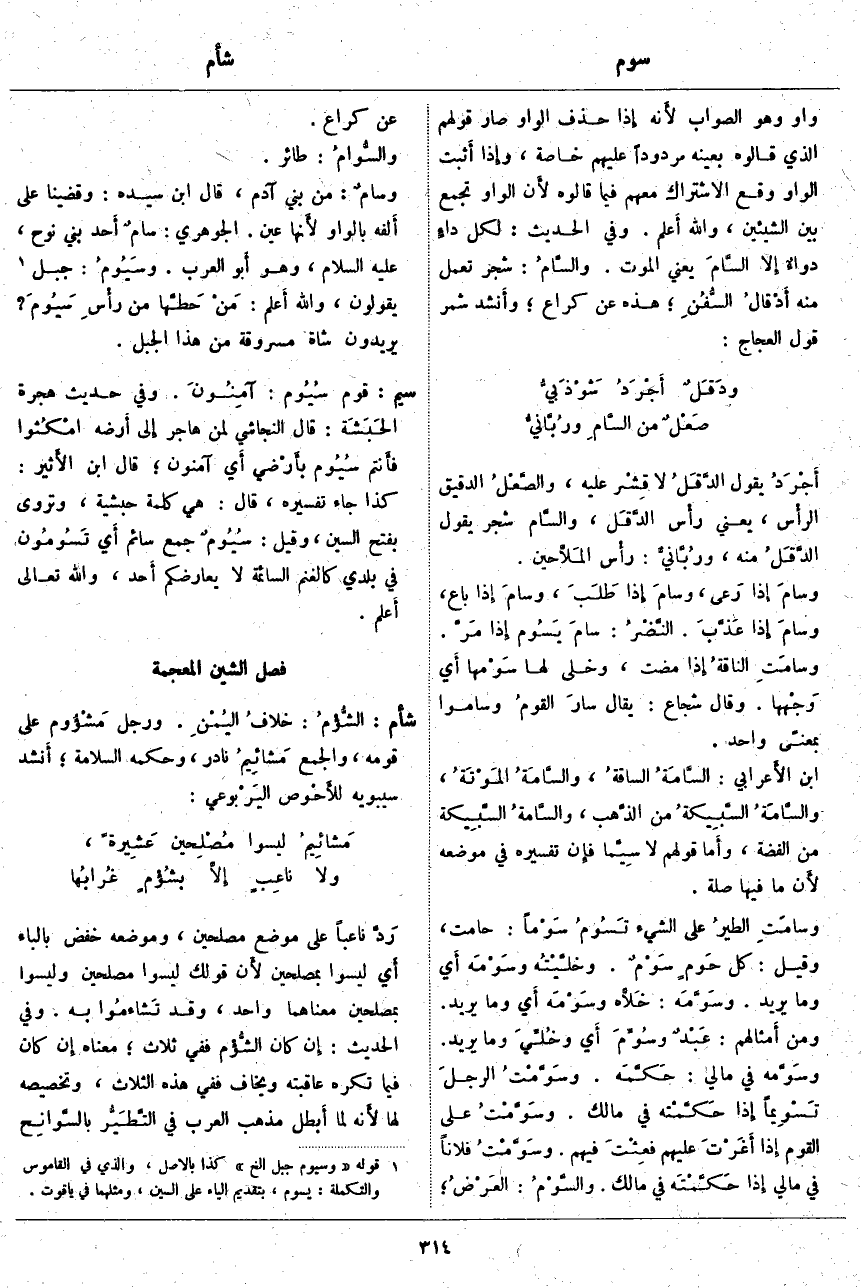 أَجْرَدُ يَقُولُ الدَّقَلُ لَا قِشْر عَلَيْهِ، والصَّعْلُ الدَّقِيقُ الرأْس، يَعْنِي رأْس الدَّقَل، والسَّام شَجَرٌ يَقُولُ الدَّقَلُ مِنْهُ، ورُبَّانيٌّ: رأْس المَلَّاحين. وسامَ إِذا رَعى، وسامَ إِذا طَلَبَ، وسامَ إِذا بَاعَ، وسامَ إِذا عَذَّبَ. النَّضْرُ: سامَ يَسُوم إِذا مَرَّ. وسامَتِ الناقةُ إِذا مَضَتْ، وَخَلَّى لَهَا سَومْها أَي وَجْهها. وَقَالَ شُجَاعٌ: يُقَالُ سارَ القومُ وَسَامُوا بِمَعْنًى وَاحِدٍ. ابْنُ الأَعرابي: السَّامَةُ الساقةُ، والسَّامَةُ المَوْتَةُ، والسَّامَةُ السَّبِيكةُ مِنَ الذَّهب، والسَّامةُ السَّبِيكة مِنَ الْفِضَّةِ، وأَما قَوْلُهُمْ لَا سِيمَّا فإِن تَفْسِيرَهُ فِي مَوْضِعِهِ لأَن مَا فِيهَا صِلَةٌ. وسامَتِ الطيرُ عَلَى الشَّيْءِ تَسُومُ سَوْماً: حَامَتْ، وَقِيلَ: كُلُّ حَومٍ سَوْمٌ. وخلَّيْتُه وسَوْمَه أَي وَمَا يُرِيدُ. وسَوَّمَه: خَلَّاه وسَوْمَه أَي وَمَا يُرِيدُ. وَمِنْ أَمثالهم: عَبْدٌ وسُوِّمَ أَي وخُلِّيَ وَمَا يُرِيدُ. وسَوَّمه فِي مَالِي: حَكَّمَه. وسَوَّمْتُ الرجلَ تَسْوِيماً إِذا حَكَّمْتَه في مالك. وسَوَّمْتُ عَلَى الْقَوْمِ إِذا أَغَرْتَ عَلَيْهِمْ فعِثْتَ فِيهِمْ. وسَوَّمْتُ فُلَانًا فِي مَالِي إِذا حَكَّمْتَه في مالك. والسَّوْمُ: العَرْضُ؛ عَنْ كُرَاعٍ. والسُّوامُ: طَائِرٌ. وسامٌ: مِنْ بَنِي آدَمَ، قَالَ ابْنُ سِيدَهْ: وَقَضَيْنَا عَلَى أَلفه بِالْوَاوِ لأَنها عَيْنٌ. الْجَوْهَرِيُّ: سامٌ أَحد بَنِي نُوحٍ، عَلَيْهِ السَّلَامُ، وَهُوَ أَبو الْعَرَبِ. وسَيُومُ: جَبَلٌ «2». يَقُولُونَ، وَاللَّهُ أَعلم: مَنْ حَطَّها مِنْ رأْسِ سَيُومَ؟ يُرِيدُونَ شَاةً مَسْرُوقَةً مِنْ هَذَا الجبل.