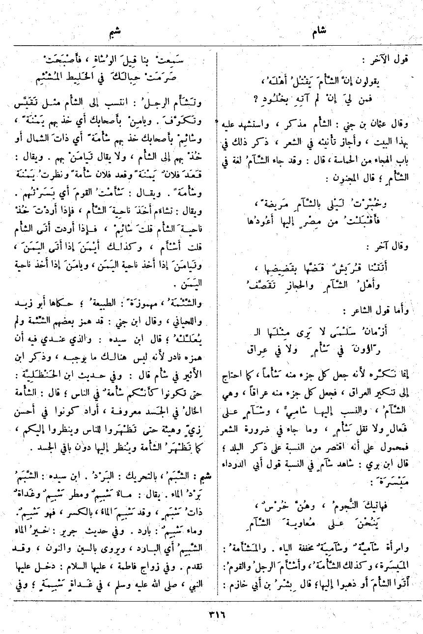 إِنما نَكَّره لأَنه جَعَلَ كُلَّ جُزْءٍ مِنْهُ شَأْماً، كَمَا احْتَاجَ إِلى تَنْكِيرِ الْعِرَاقِ، فَجَعَلَ كُلَّ جُزْءٍ مِنْهُ عِرَاقًا، وَهِيَ الشَّآمُ، وَالنَّسَبُ إِليها شامِيٌّ، وشَآمٍ عَلَى فَعالٍ وَلَا تَقُلْ شَأْمٍ، وَمَا جَاءَ فِي ضَرُورَةِ الشِّعْرِ فَمَحْمُولٌ عَلَى أَنه اقْتَصَرَ مِنَ النِّسْبَةِ عَلَى ذِكْرِ الْبَلَدَ؛ قَالَ ابْنُ بَرِّيٍّ: شَاهِدُ شآمٍ فِي النِّسْبَةِ قَوْلُ أَبي الدَّرْدَاءِ مَيْسَرَةَ: