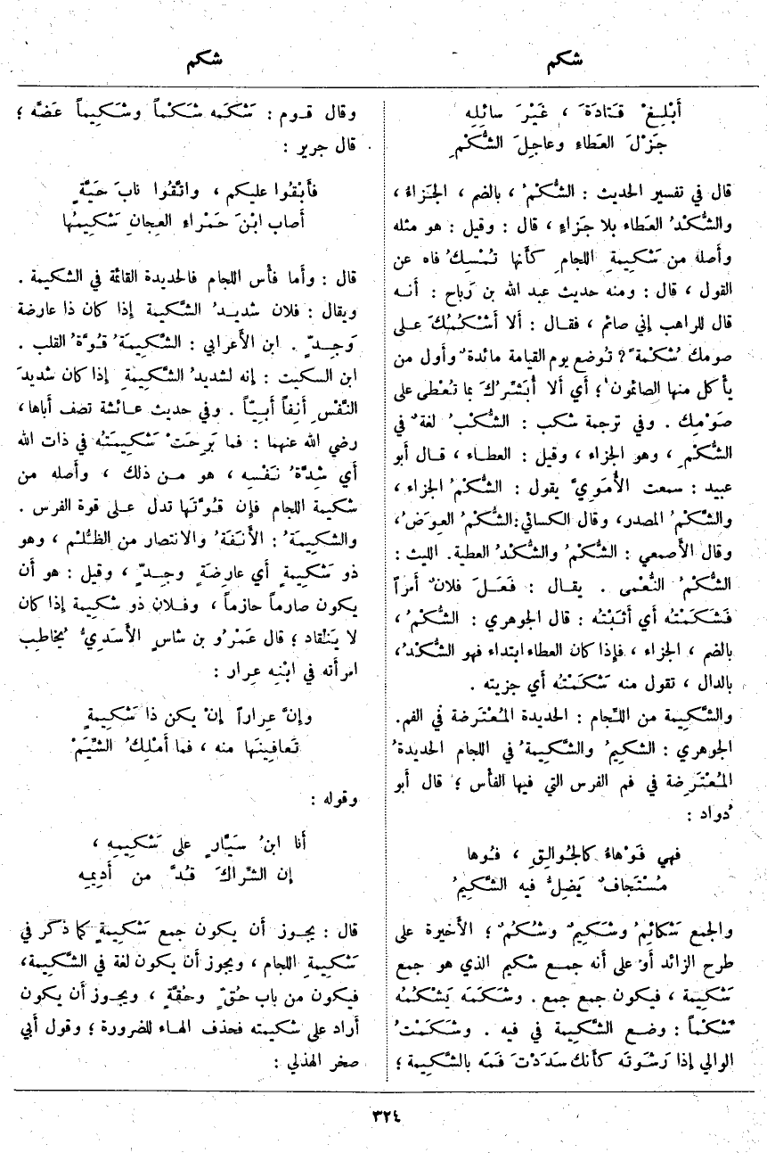 ؛ أَي أَلا أُبَشِّرُكَ بِمَا تُعْطى عَلَى صَوْمِك. وَفِي تَرْجَمَةِ شَكَبَ: الشُّكْبُ لغةٌ فِي الشُّكْمِ، وَهُوَ الْجَزَاءُ، وَقِيلَ: الْعَطَاءُ، قَالَ أَبو عُبَيْدٍ: سَمِعْتُ الأُمَوِيَّ يَقُولُ: الشُّكْمُ الْجَزَاءُ، والشَّكْمُ الْمَصْدَرُ، وَقَالَ الْكِسَائِيُّ: الشُّكْمُ العِوَضُ، وَقَالَ الأَصمعي: الشُّكْمُ والشُّكْدُ الْعَطِيَّةُ. اللَّيْثُ: الشُّكْمُ النُّعْمى. يُقَالُ: فَعَلَ فلانٌ أَمراً فَشَكَمْتُه أَي أَثَبْتُه: قَالَ الْجَوْهَرِيُّ: الشُّكْمُ بِالضَّمِّ، الْجَزَاءُ، فإِذا كَانَ الْعَطَاءُ ابْتِدَاءً فَهُوَ الشُّكْدُ، بِالدَّالِ، تَقُولُ مِنْهُ شَكَمْتُه أَي جَزَيْتُهُ. والشَّكِيمة مِنَ اللِّجام: الْحَدِيدَةُ المُعْتَرضة فِي الْفَمِ. الْجَوْهَرِيُّ: الشكِيمُ والشَّكِيمةُ فِي اللِّجَامِ الحديدةُ المُعْتَرِضة فِي فَمِ الْفَرَسِ التي فيها الفأْس؛ قال أَبو دُواد: