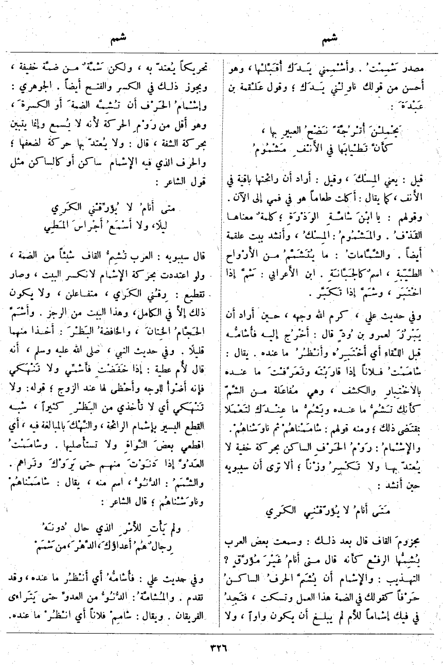 قَالَ سِيبَوَيْهِ: الْعَرَبُ تُشِمُّ الْقَافَ شَيْئًا مِنَ الضَّمَّةِ، وَلَوِ اعْتَدَدَّتْ بِحَرَكَةِ الإِشمام لَانْكَسَرَ الْبَيْتُ، وَصَارَ تَقْطِيعُ: رِقُني الكَري، مُتَفَاعِلُنْ، وَلَا يَكُونُ ذَلِكَ إِلَّا فِي الْكَامِلِ، وَهَذَا الْبَيْتُ مِنَ الرَّجَزِ. وأَشَمَّ الحَجَّامُ الخِتانَ، والخافضةُ البَظْرَ: أَخذا مِنْهُمَا قَلِيلًا. وَفِي حَدِيثِ