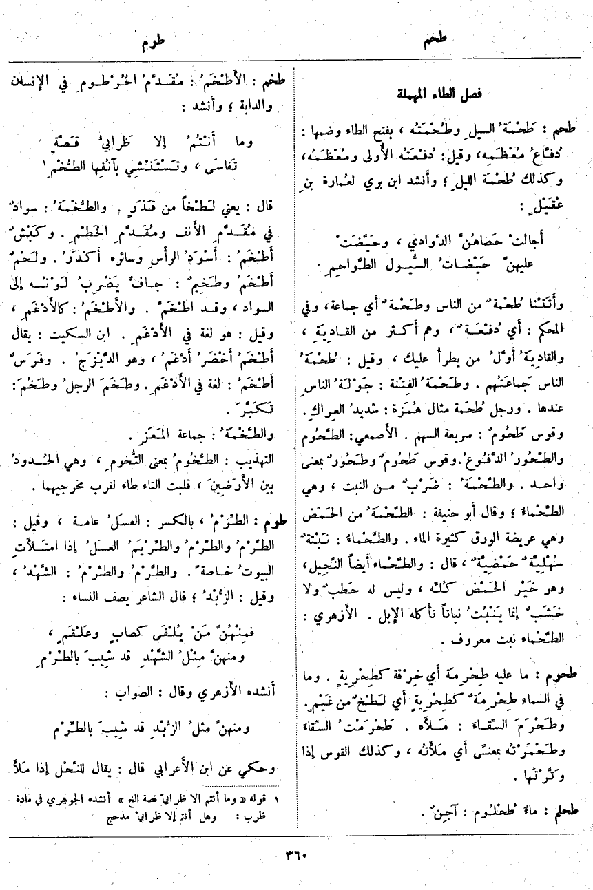 طحم: طَحْمَةُ السيلِ وطُحْمَتُه، بِفَتْحِ الطَّاءِ وَضَمِّهَا: دُفَّاعُ مُعْظَمِه، وَقِيلَ: دُفْعَتُه الأُولى ومُعْظَمُه، وَكَذَلِكَ طُحْمَة الليلِ؛ وأَنشد ابْنُ بَرِّيٍّ لعُمارة بنِ عُقَيْلٍ: