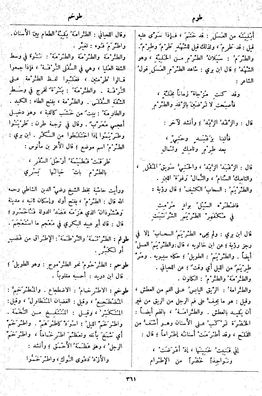 وَقَالَ اللِّحْيَانِيُّ: الطُّرامَةُ بَقِيَّةُ الطَّعَامِ بَيْنَ الأَسنان. واطَّرَمَ فُوه: تغيَّر. والطُّرْمَة والطَّرْمَة والطِّرْمَةُ: نُتُوءٌ فِي وَسَطِ الشَّفَةِ العُليا، وَهِيَ فِي السُّفْلى التُّرْفَةُ، فَإِذَا جَمَعُوا قَالُوا طُرْمتين، فغَلَّبوا لَفْظَ الطُّرْمة عَلَى التُّرْفَة. والطُّرْمَةُ: بَثْرَةٌ تَخْرُجُ فِي وسَطِ الشَّفَةِ السُّفْلَى. والطَّرْمة، بِفَتْحِ الطَّاءِ: الْكَبِدُ. والطارِمَةُ: بيتٌ مِنْ خَشَب كَالْقُبَّةِ، وَهُوَ دَخِيلٌ أَعجمي مُعَرَّبٌ. وَقَالَ فِي تَرْجَمَةِ طَرَنَ: طَرْيَنُوا وطَرْيَمُوا إِذَا اخْتَلَطوا مِنَ السُّكْر. ابْنُ بَرِّيٍّ: الطَّرْمُ اسْمُ مَوْضِعٍ؛ قَالَ الأَعز بْنُ مأْنوس: