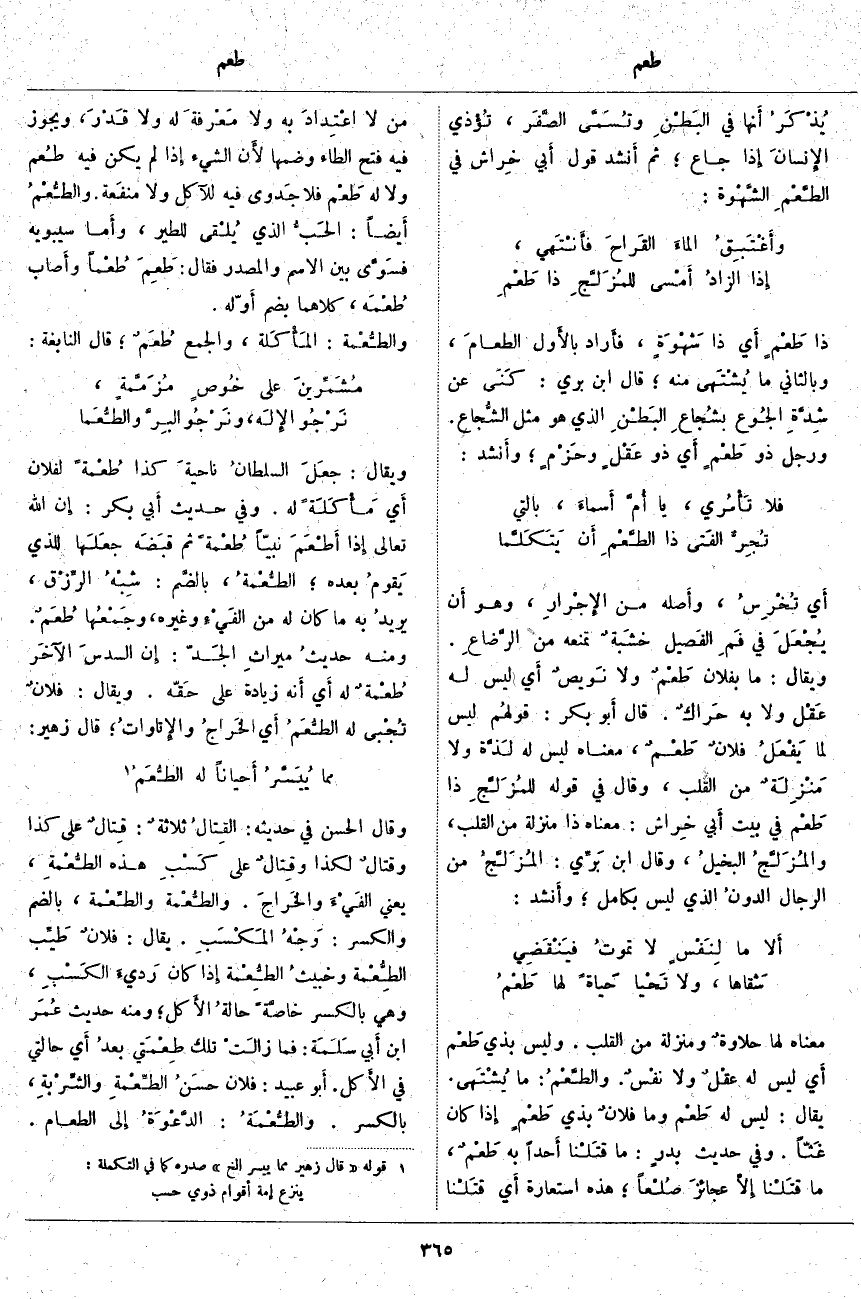 ذَا طَعْمٍ أَي ذَا شَهْوَةٍ، فأَراد بالأَول الطعامَ، وَبِالثَّانِي مَا يُشْتَهى مِنْهُ؛ قَالَ ابْنُ بَرِّيٍّ: كَنَى عَنْ شِدَّةِ الجُوع بشُجاعِ البَطْنِ الَّذِي هُوَ مِثْلُ الشُّجاع. وَرَجُلٌ ذُو طَعْمٍ أَي ذُو عَقْلٍ وحَزْمٍ؛ وأَنشد:
