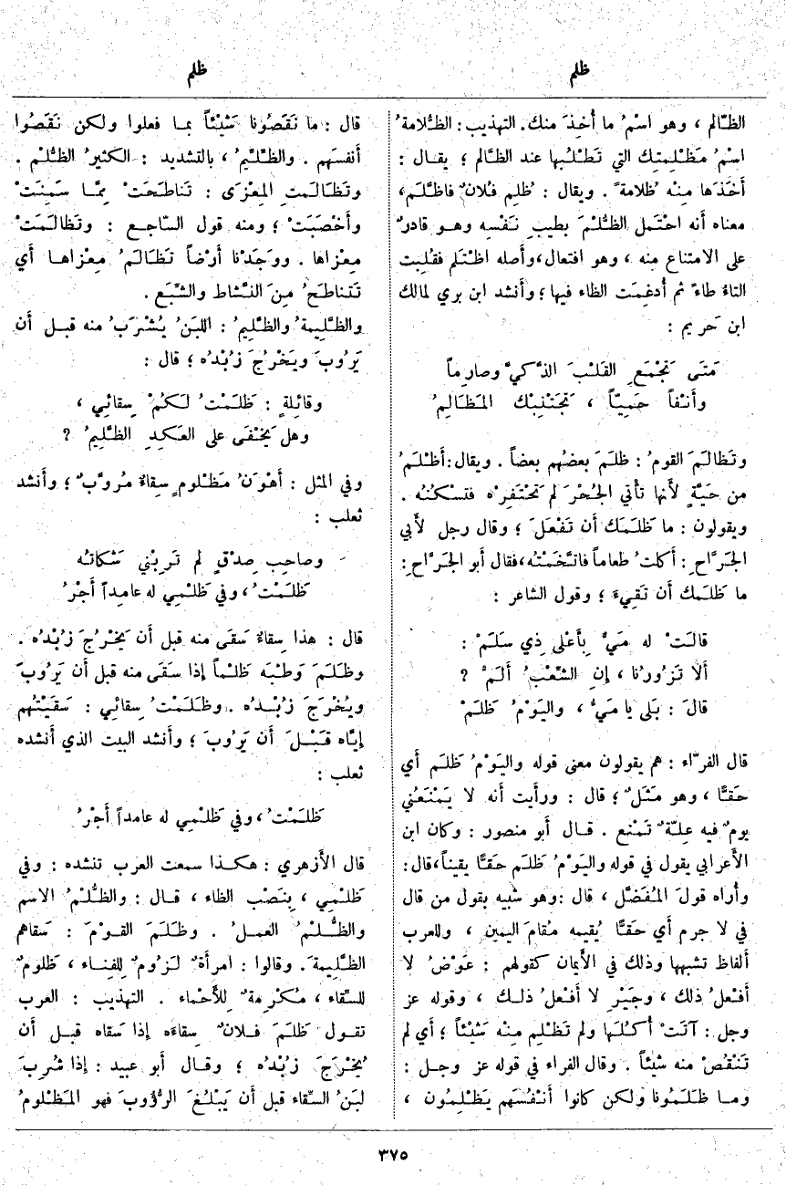 الظَّالِمِ، وَهُوَ اسْمُ مَا أُخِذَ مِنْكَ. التَّهْذِيبَ: الظُّلامةُ اسْمُ مَظْلِمتِك الَّتِي تَطْلُبها عِنْدَ الظَّالم؛ يُقَالُ: أَخَذَها مِنه ظُلامةً. وَيُقَالُ: ظُلِم فُلانٌ فاظَّلَم، مَعْنَاهُ أَنَّهُ احْتَمل الظُّلْمَ بطيبِ نَفْسِه وَهُوَ قادرٌ عَلَى الِامْتِنَاعِ مِنْهُ، وَهُوَ افْتِعَالٌ، وأَصله اظْتَلم فقُلِبت التاءُ طَاءً ثُمَّ أُدغِمَت الظَّاءُ فِيهَا؛ وأَنشد ابْنُ بَرِّيٍّ لِمَالِكِ بْنِ حَريم: