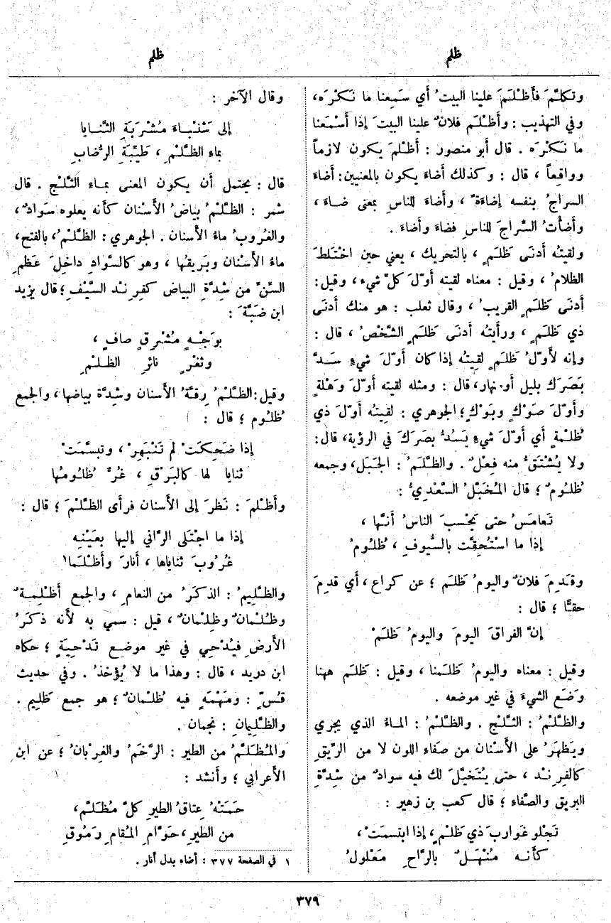وَقِيلَ: مَعْنَاهُ واليومُ ظَلَمنا، وَقِيلَ: ظَلَم هَاهُنَا وَضَع الشيءَ فِي غَيْرِ مَوْضِعِهِ. والظَّلْمُ: الثَّلْج. والظَّلْمُ: الماءُ الَّذِي يَجْرِي ويَظهَرُ عَلَى الأَسْنان مِنْ صَفاءِ اللَّوْنِ لَا مِنَ الرِّيقِ كالفِرِنْد، حَتَّى يُتَخيَّلَ لَكَ فِيهِ سوادٌ مِنْ شِدَّةِ الْبَرِيقِ والصَّفاء؛ قَالَ كَعْبُ بْنُ زُهَيْرٍ: