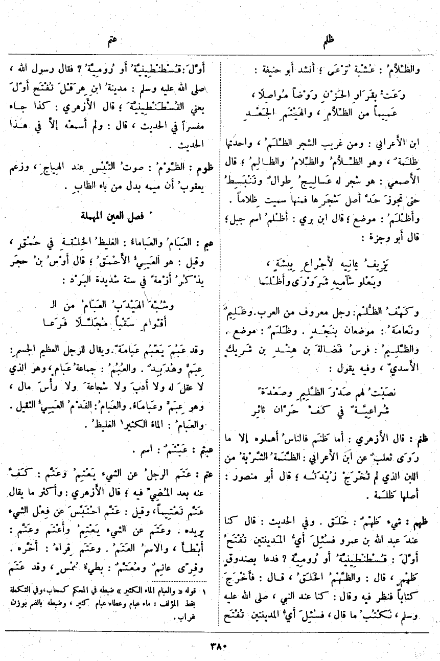 ظنم: قَالَ الأَزهري: أَما ظَنَم فالناسُ أَهملوه إِلَّا مَا رَوَى ثعلبٌ عَنِ ابْنِ الأَعرابي: الظَّنَمةُ الشَّرْبةُ مِنَ اللَّبَنِ الَّذِي لَمْ تُخْرَجْ زُبْدَتُه؛ قَالَ أَبو مَنْصُورٍ: أَصلها ظَلَمة.