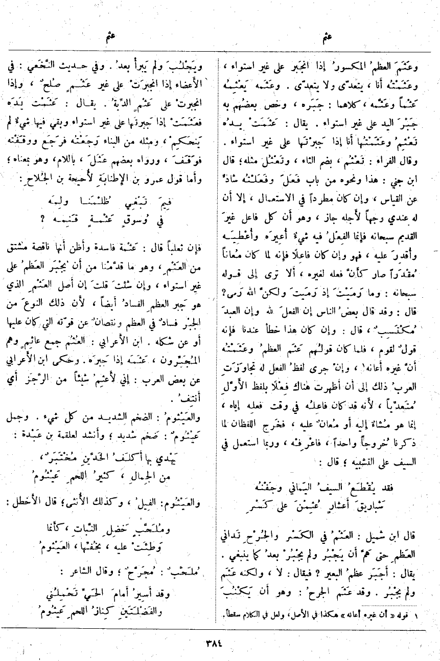فَإِنَّ ثَعْلَبًا قَالَ: عَثْمة فَاسِدَةٌ وأَظن أَنها نَاقِصَةٌ مُشْتَقٌّ مِنَ العَثْمِ، وَهُوَ مَا قدَّمْنا مِنْ أَن يجْبَر العَظمُ عَلَى غَيْرِ اسْتِوَاءٍ، وَإِنْ شئتَ قلتَ إِنَّ أَصل العَثْمِ الَّذِي هُوَ جَبر العظمِ الفسادُ أَيضاً، لأَن ذَلِكَ النوعَ مِنَ الجبْر فسادٌ فِي الْعَظْمِ ونقصانٌ عَنْ قُوَّتِهِ الَّتِي كَانَ عَلَيْهَا أَو عَنْ شَكْلِهِ. ابْنُ الأَعرابي: العُثُم جَمْعُ عاثِمٍ وَهُمُ المُجَبِّرون، عَثَمَه إِذَا جَبَرَه. وَحَكَى ابْنُ الأَعرابي عَنْ بَعْضِ الْعَرَبِ: إِنِّي لأَعثِم شَيْئًا مِنَ الرَّجَز أَي أَنتِفُ. والعَيْثومُ: الضَّخْمُ الشَّدِيدُ مِنْ كُلِّ شَيْءٍ. وَجَمَلٌ عَيْثُومٌ: ضَخم شَدِيدٌ؛ وأَنشد لِعَلْقَمَةَ بْنِ عَبْدة:
