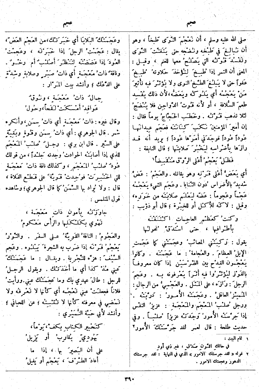 وَقَالَ غَيْرُهُ: ذاتُ مَعْجَمةٍ أَي ذاتُ سِمَنٍ، وأَنكره شَمِرٌ. قَالَ الْجَوْهَرِيُّ: أَيْ ذاتُ سِمَن وقُوةٍ وبَقِيَّةٍ عَلَى السَّير. قَالَ ابْنُ بَرِّيٍّ: رجلٌ صُلْبُ المَعْجَم لِلَّذِي إِذَا أَصابَتْه الحوادثُ وَجَدَتْهُ جَلْداً، مِنْ قَوْلِكَ عُودٌ صُلْبُ المَعْجَمِ، وَكَذَلِكَ نَاقَةٌ ذاتُ مَعْجَمةٍ لِلَّتِي اخْتُبِرَتْ فوُجِدتْ قَويَّةً عَلَى قَطْع الفَلاة، قَالَ: وَلَا يُراد بِهَا السِّمَنُ كَمَا قَالَ الْجَوْهَرِيُّ؛ وَشَاهِدُهُ قَوْلُ الْمُتَلَمِّسُ: