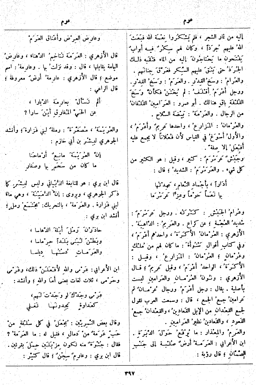 إِليه مِنْ ثِمَارِ الشَّجَرِ، فَلَمْ يَشْكُروا نِعْمَة اللَّهِ فبَعَثَ اللهُ عَلَيْهِمْ جُرَذاً، وَكَانَ لَهُمْ سِكْرٌ فِيهِ أَبوابٌ يَفْتَحون مَا يَحْتاجُونَ إِليه مِنْ الْمَاءِ فثَقَبه ذَلِكَ الجُرَذُ حَتَّى بَثَقَ عَلَيْهِمُ السِكر فغَرَّقَ جِنانَهم. والعُرامُ: وسَخُ القِدْرِ. والعَرَمُ: وَسَخُ القِدْرِ. وَرَجُلٌ أَعْرَمُ أَقْلَفُ: لَمْ يُخْتَنْ فكأَنَّ وَسَخَ القُلْفَةِ باقٍ هُنَالِكَ. أَبو عَمْرٍو: العَرَامِينُ القُلْفانُ مِنَ الرِّجَالِ. والعَرْمَةُ: بَيْضَة السِّلاح. والعُرْمانُ: المَزارِعُ، وَاحِدُهَا عَرِيمٌ وأَعْرَمُ، والأَولُ أَسْوَغُ فِي الْقِيَاسِ لأَن فُعْلاناً لَا يُجْمَعُ عَلَيْهِ أَفْعَلُ إِلا صِفةً. وجَيْشٌ عَرَمْرَمٌ: كَثِيرٌ، وَقِيلَ: هُوَ الْكَثِيرُ مِنْ كُلِّ شَيْءٍ. والعَرَمْرَمُ: الشديدُ؛ قَالَ: