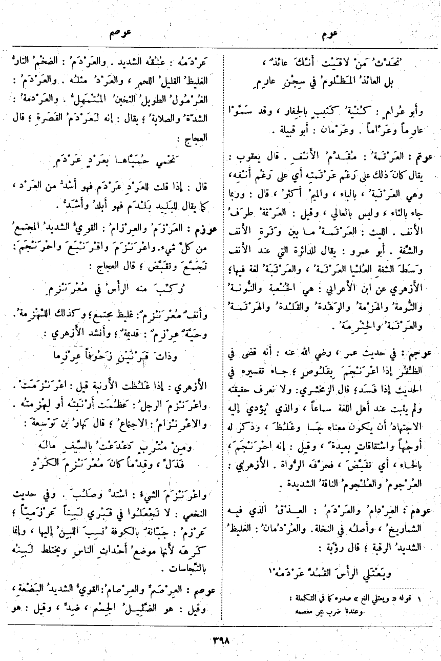 عرزم: العَرْزَمُ والعِرْزامُ: القوِيُّ الشديدُ المجتمعُ مِنْ كلِّ شَيْءٍ. واعْرَنْزَمَ واقْرَنْبَعَ واحْرَنْجَمَ: تَجَمَّعَ وتقَبَّض؛ قَالَ الْعَجَّاجُ: