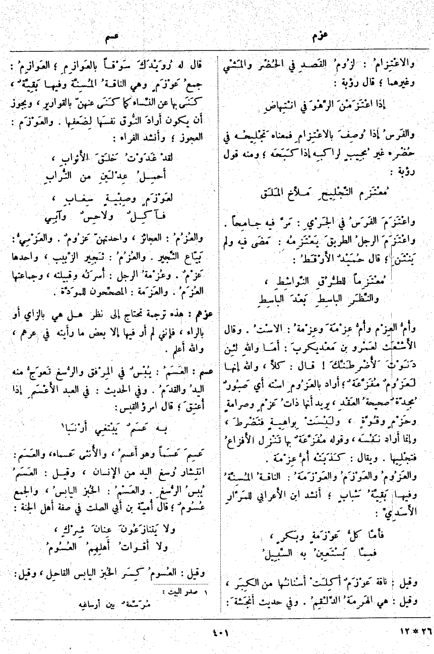وأُمُّ العِزْم وأُمُّ عِزْمَةَ وعِزْمةُ: الاسْتُ. وَقَالَ الأَشْعَث لعَمْرو بن مَعْديكربَ: أمَا واللهِ لئِن دَنَوْتَ لأُضْرِطَنَّكَ قَالَ: كلَّا، وَاللَّهِ إِنَّهَا لَعَزُومٌ مُفَزَّعَةٌ؛ أَرَادَ بالعَزُومِ اسْته أَيْ صَبُورٌ مُجِدّةٌ صحيحةُ العَقْدِ، يُرِيدُ أَنها ذاتُ عَزْمٍ وصرامةٍ وحَزْمٍ وقُوَّةٍ، ولَيْسَتْ بِواهِيةٍ فتَضْرطَ، وَإِنَّمَا أَرَادَ نَفْسَه، وَقَوْلُهُ مُفَزَّعَةٌ بِهَا تَنْزِل الأَفزاعُ فتجْلِيها. وَيُقَالُ: كَذَبَتْه أُمُّ عِزْمَة. والعَزُومُ والعَوْزَمُ والعَوْزَمَةُ: الناقةُ المُسِنَّةُ وَفِيهَا بَقِيَّةُ شَبابٍ؛ أَنشد ابْنُ الأَعرابي للمَرَّارِ الأَسَدِيِّ: