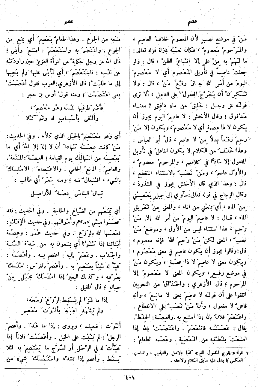 بِمَعْنَى لَا مانِعَ، وَأَنَّهُ فاعلٌ لَا مَفْعُولٌ، وأنَّ مِنَ نَصْبٌ عَلَى الِانْقِطَاعِ. واعْتَصَمَ فلانٌ بِاللَّهِ إِذَا امْتَنَعَ بِهِ. والعِصْمة: الحِفْظُ. يُقَالُ: عَصَمْتُه فانْعَصَمَ. واعْتَصَمْتُ بِاللَّهِ إِذَا امتنعْتَ بلُطْفِه مِنَ المَعْصِية. وعَصَمه الطعامُ: منَعه مِنَ الْجُوعِ. وَهَذَا طعامٌ يَعْصِمُ أَيْ يَمْنَعُ مِنَ الْجُوعِ. واعْتَصَمَ بِهِ واسْتَعْصَمَ: امتنعَ وأبَى؛ قَالَ اللَّهُ عَزَّ وَجَلَّ حِكَايَةً عَنِ امرأَة الْعَزِيزِ حِينَ راودَتْه عَنْ نفْسِه: فَاسْتَعْصَمَ