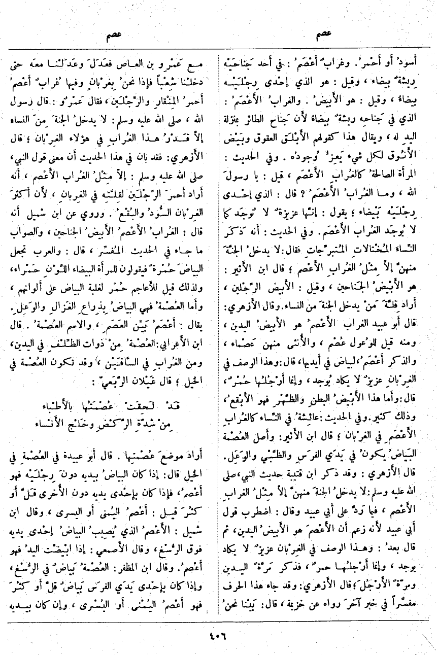 ؛ قَالَ ابْنُ الأَثير: هُوَ الأَبْيضُ الجَناحين، وَقِيلَ: الأَبيض الرِّجْلين، أَرَادَ قِلَّةَ مَنْ يَدْخُلُ الجنةَ مِنَ النِّسَاءِ. وَقَالَ الأَزهري: قَالَ أَبُو عُبَيْدٍ الْغُرَابُ الأَعْصمُ هُوَ الأَبيضُ الْيَدَيْنِ، وَمِنْهُ قِيلَ للوُعول عُصْم، والأُنثى مِنْهُنَّ عَصْماء، وَالذَّكَرُ أَعْصَمُ، لِبَيَاضٍ فِي أَيْدِيهَا، قَالَ: وَهَذَا الْوَصْفُ فِي الغِرْبانِ عزيزٌ لَا يَكَادُ يُوجد، وَإِنَّمَا أَرْجُلُها حُمْرٌ، قَالَ: وَأَمَّا هَذَا الأَبْيضُ البطنِ والظَّهْرِ فَهُوَ الأَبْقعُ، وَذَلِكَ كَثِيرٌ. وَفِي الْحَدِيثِ: