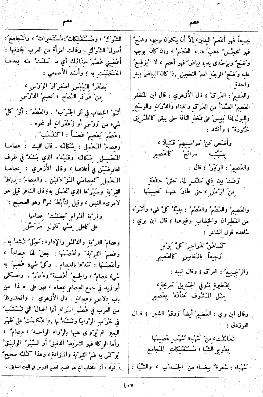 أَثَرُ الخِضاب فِي أَثَرِ الجَرَب «1». والعُصْمُ: أثرُ كلِّ شَيْءٍ مِنْ وَرْسٍ أَوْ زَعْفَرانٍ أَوْ نَحْوِهِ. وعَصَمَ يَعْصِمُ عَصْماً: اكْتَسَبَ. وعِصامُ المَحْمِل: شِكالُه. قَالَ اللَّيْثُ: عِصَامَا المَحْمِلِ شِكالُه وقَيْدُه الَّذِي يُشَدُّ فِي طَرَفِ العارِضَيْن فِي أَعلاهما، وَقَالَ الأَزهري: عِصاما المَحْمِلِ كعِصامَي المَزَادَتيْن. والعِصامُ: رِباطُ القِرْبةِ وسَيْرُها الَّذِي تُحْمَل بِهِ؛ قَالَ الشَّاعِرَ قِيلَ هُوَ لِامْرِئِ الْقَيْسِ، وَقِيلَ لِتأَبَّط شَرًّا وَهُوَ الصَّحِيحُ: