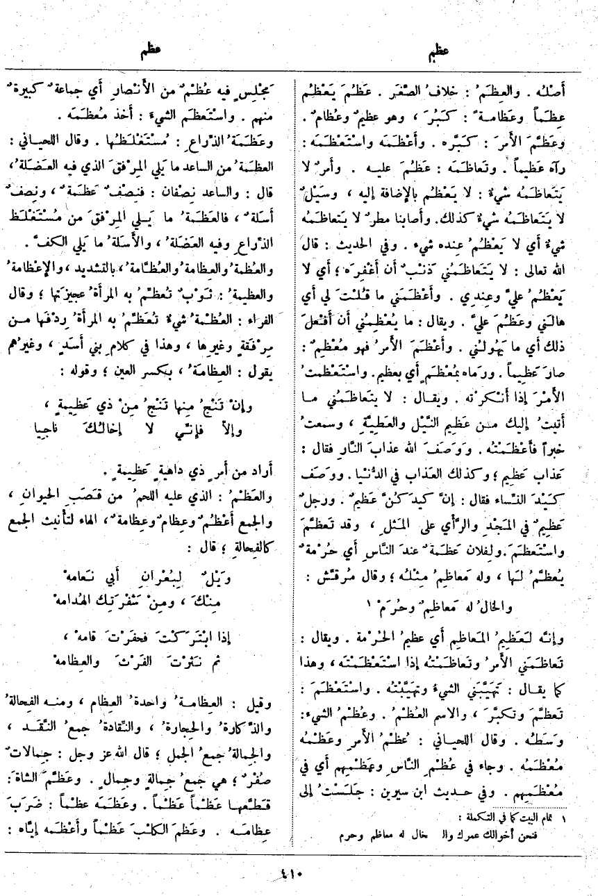 أَراد مِنْ أَمرٍ ذِي داهيةٍ عَظِيمةٍ. والعَظْمُ: الَّذِي عَلَيْهِ اللحمُ مِنْ قَصَبِ الحيوانِ، وَالْجَمْعُ أَعْظُمٌ وعِظامٌ وعِظامةٌ، الْهَاءُ لتأْنيث الْجَمْعِ كالفِحالةِ؛ قَالَ: