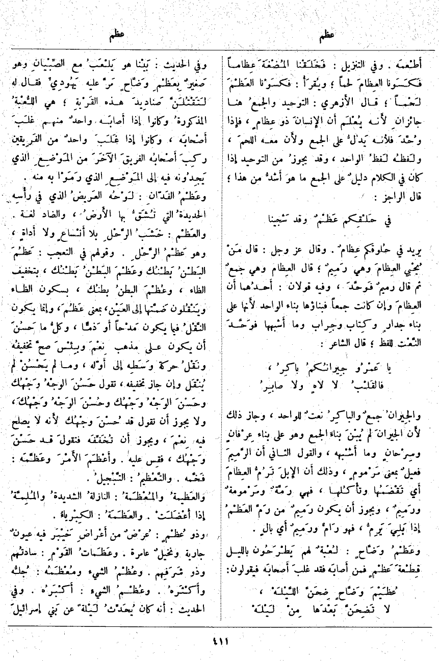 ؛ قَالَ الأَزهري: التَّوْحِيدُ والجمعُ هُنَا جائزانِ لأَنه يُعْلَم أَنَّ الإِنسانَ ذُو عِظامٍ، فَإِذَا وُحِّدَ فلأَنه يَدُلُّ عَلَى الْجَمْعِ ولأَن مَعَهُ اللحمَ، ولَفظُه لَفظُ الْوَاحِدِ، وَقَدْ يَجُوزُ مِنَ التَّوْحِيدِ إِذَا كَانَ فِي الْكَلَامِ دليلٌ عَلَى الْجَمْعِ مَا هُوَ أَشدُّ مِنْ هَذَا؛ قَالَ الرَّاجِزُ: