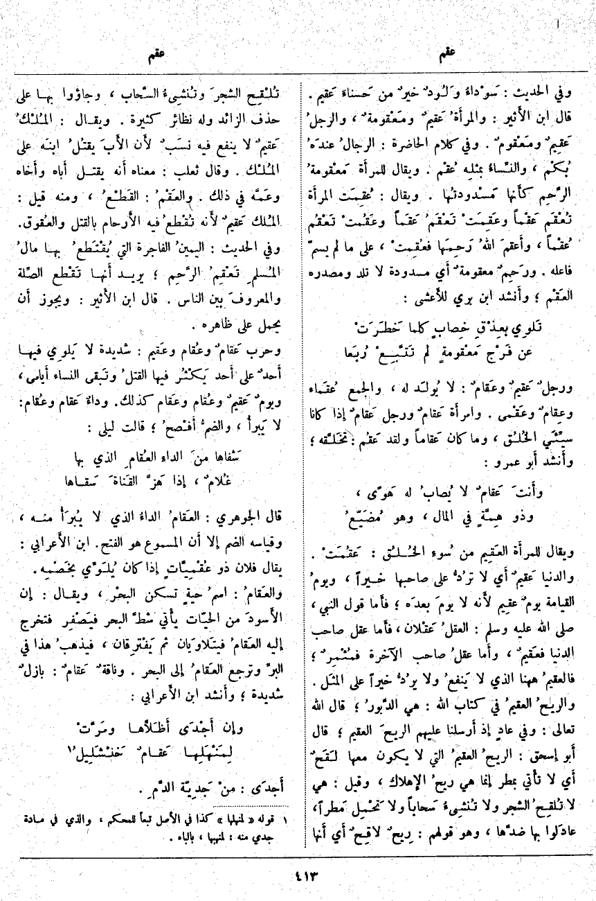 ؛ يُرِيدُ أَنَّهَا تَقْطع الصِّلة والمعروفَ بَيْنَ النَّاسِ. قَالَ ابْنُ الأَثير: وَيَجُوزُ أَنْ يُحْمَلَ عَلَى ظَاهِرِهِ. وَحَرْبٌ عَقامٌ وعُقام وعَقيم: شَدِيدَةٌ لَا يَلوِي فِيهَا أَحدٌ عَلَى أَحَدٍ يَكْثُر فِيهَا القتلُ وتَبقى النِّسَاءُ أَيامى، ويومٌ عَقيمٌ وعُقام وعَقام كَذَلِكَ. وداءٌ عَقام وعُقام: لَا يَبرأُ، والضمُّ أَفْصحُ؛ قَالَتْ لَيْلَى: