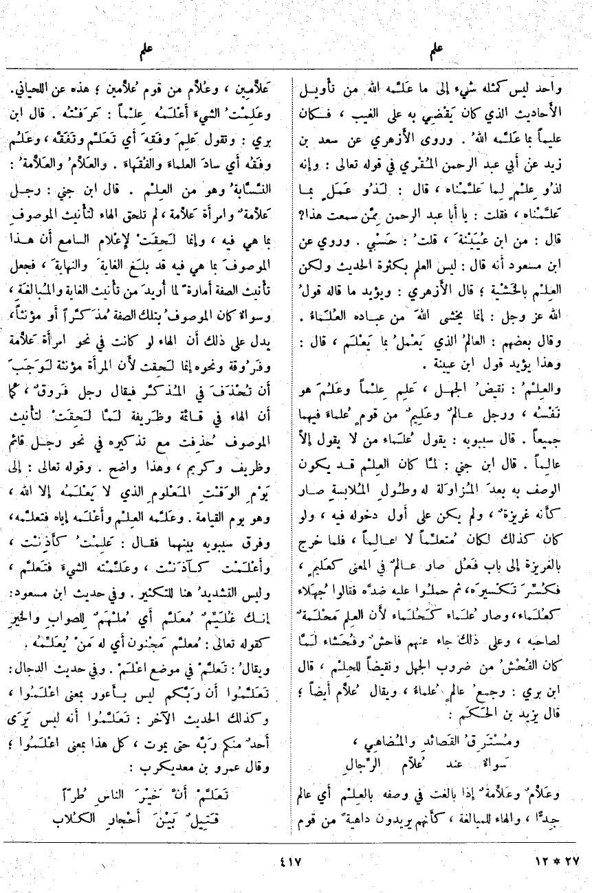 . وَقَالَ بَعْضُهُمُ: العالمُ الَّذِي يَعْملُ بِمَا يَعْلَم، قَالَ: وَهَذَا يُؤَيِّدُ قَوْلَ ابْنِ عُيَيْنَةَ. والعِلْمُ: نقيضُ الْجَهْلِ، عَلِم عِلْماً وعَلُمَ هُوَ نَفْسُه، وَرَجُلٌ عالمٌ وعَلِيمٌ مِنْ قومٍ عُلماءَ فِيهِمَا جَمِيعًا. قَالَ سِيبَوَيْهِ: يَقُولُ عُلَماء مَنْ لَا يَقُولُ إِلَّا عالِماً. قَالَ ابْنُ جِنِّي: لمَّا كَانَ العِلْم قَدْ يَكُونُ الْوَصْفُ بِهِ بعدَ المُزاوَلة لَهُ وطُولِ المُلابسةِ صَارَ كَأَنَّهُ غريزةٌ، وَلَمْ يَكُنْ عَلَى أَوَّلِ دُخُولِهِ فِيهِ، وَلَوْ كَانَ كَذَلِكَ لَكَانَ مُتعلِّماً لَا عالِماً، فَلَمَّا خَرَجَ بِالْغَرِيزَةِ إِلَى بَابِ فَعُل صَارَ عالمٌ فِي الْمَعْنَى كعَليمٍ، فكُسِّرَ تَكْسيرَه، ثُمَّ حملُوا عَلَيْهِ ضدَّه فَقَالُوا جُهَلاء كعُلَماء، وَصَارَ عُلَماء كَحُلَماء لأَن العِلمَ محْلَمةٌ لِصَاحِبِهِ، وَعَلَى ذَلِكَ جَاءَ عَنْهُمْ فاحشٌ وفُحشاء لَمَّا كَانَ الفُحْشُ مِنْ ضُرُوبِ الْجَهْلِ وَنَقِيضًا للحِلْم، قَالَ ابْنُ بَرِّيٍّ: وجمعُ عالمٍ عُلماءُ، وَيُقَالُ عُلّام أَيْضًا؛ قَالَ يَزِيدُ بْنُ الحَكَم: