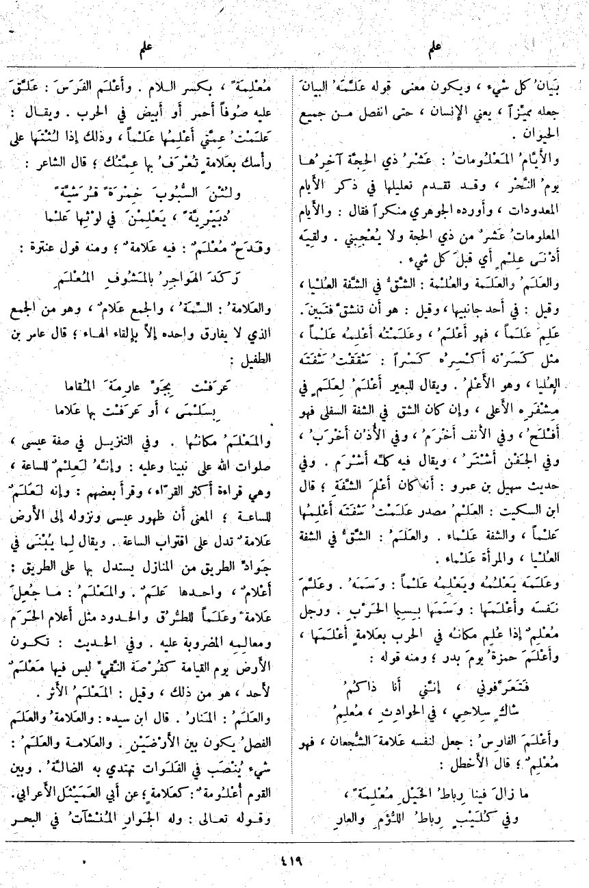 بَيانُ كُلِّ شَيْءٍ، وَيَكُونُ مَعْنَى قَوْلِهِ عَلَّمَهُ البيانَ جَعَلَهُ مميَّزاً، يَعْنِي الإِنسان، حَتَّى انْفَصَلَ مِنْ جَمِيعِ الْحَيَوَانِ. والأَيَّامُ المَعْلُوماتُ: عَشْرُ ذِي الحِجَّة آخِرُها يومُ النَّحْر، وَقَدْ تَقَدَّمَ تَعْلِيلُهَا فِي ذِكْرِ الأَيام الْمَعْدُودَاتِ، وَأَوْرَدَهُ الْجَوْهَرِيُّ مُنْكِرًا فَقَالَ: والأَيام المعلوماتُ عَشْرٌ مِنْ ذِي الْحِجَّةِ وَلَا يُعْجِبني. ولقِيَه أَدْنَى عِلْمٍ أَيْ قبلَ كُلِّ شَيْءٍ. والعَلَمُ والعَلَمة والعُلْمة: الشَّقُّ فِي الشَّفة العُلْيا، وَقِيلَ: فِي أَحَدِ جَانِبَيْهَا، وَقِيلَ: هُوَ أَن تنشقَّ فتَبينَ. عَلِمَ عَلَماً، فَهُوَ أَعْلَمُ، وعَلَمْتُه أَعْلِمُه عَلْماً، مِثْلُ كَسَرْته أكْسِرهُ كَسْراً: شَقَقْتُ شَفَتَه العُليا، وَهُوَ الأَعْلمُ. وَيُقَالُ لِلْبَعِيرِ أَعْلَمُ لِعَلَمٍ فِي مِشْفَرِه الأَعلى، وَإِنْ كَانَ الشَّقُّ فِي الشَّفَةِ السُّفْلَى فَهُوَ أَفْلَحُ، وَفِي الأَنف أَخْرَمُ، وَفِي الأُذُن أَخْرَبُ، وَفِي الجَفْن أَشْتَرُ، وَيُقَالُ فِيهِ كلِّه أَشْرَم. وَفِي حَدِيثِ