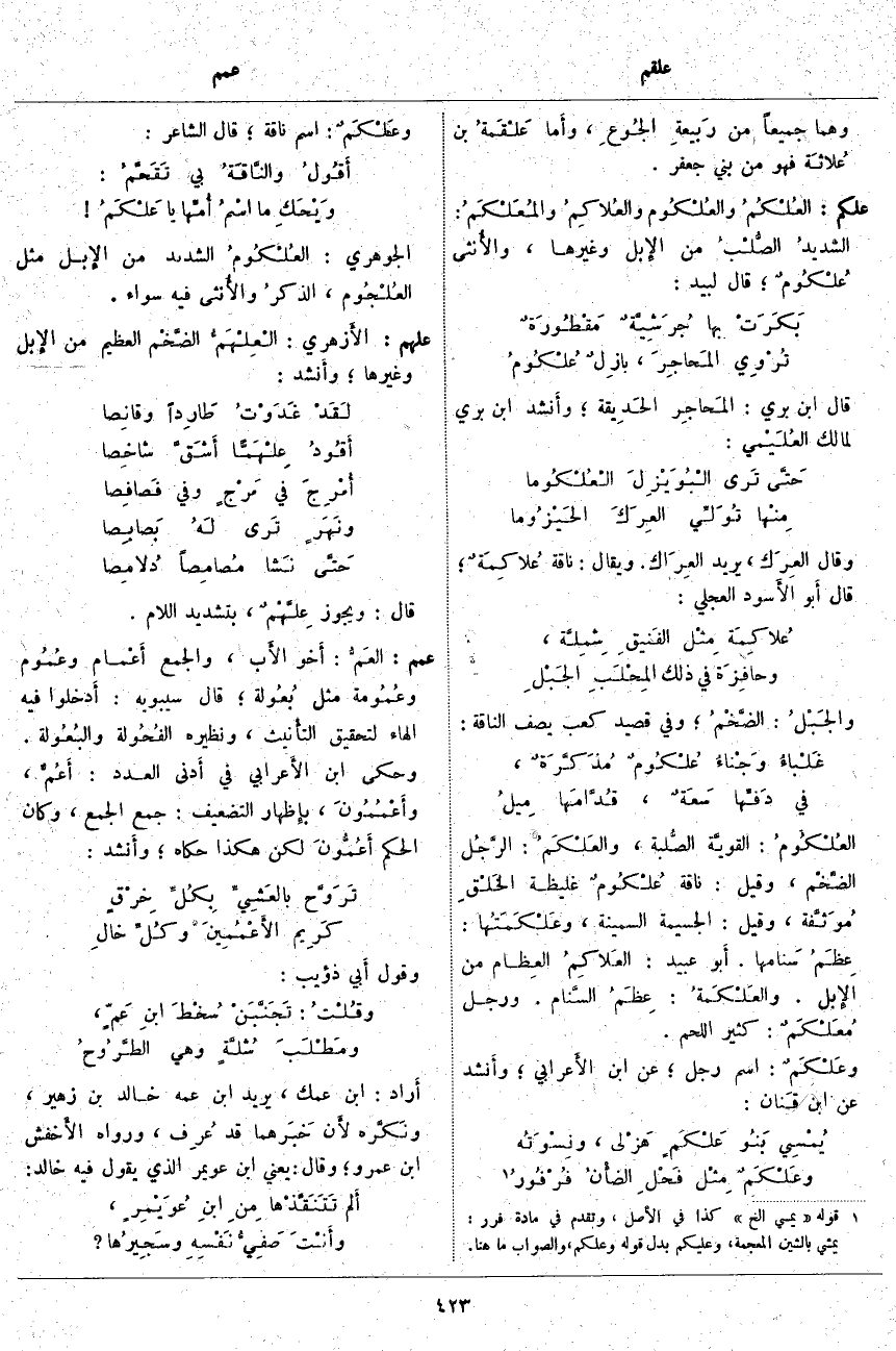 علكم: العُلْكُمُ والعُلْكُوم والعُلاكِمُ والمُعَلْكَمُ: الشديدُ الصُّلْبُ مِنَ الإِبل وَغَيْرِهَا، والأَنثى عُلْكُومٌ؛ قال لبيد: